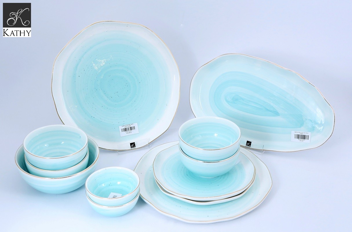 Miêu tả: bát Sứ xương cao cấp Kathy simplexanh cao cấp sang trọng. Bộ bát đĩa kết hợp bằng kiểu dáng trẻ trung và màu sắc những chiếc bát, chiếc đĩa tạo lên sự đặc biệt trên bàn ăn