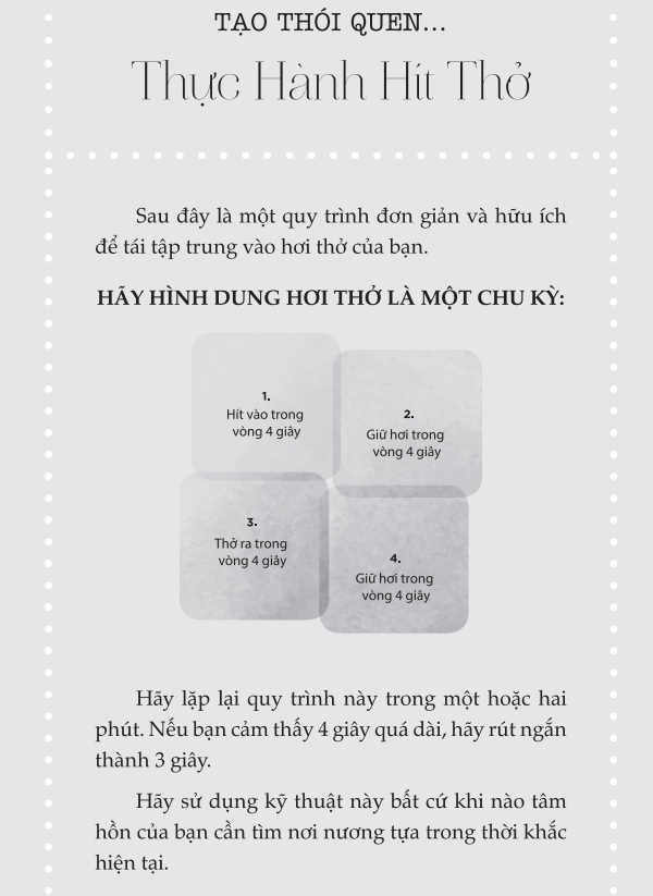 Ở cuối mỗi chương, bạn sẽ tìm thấy một trang phụ có tiêu đề “Tạo Thói Quen...". Đây là nơi để chúng ta thực hành những bài học và khám phá những cách thức dẫn truyền năng lượng tích cực vào cuộc sống thường nhật. Sau khi dành thời gian soi chiếu vào nội tâm trong lúc đọc những chương này, đồng thời đã xác định những phương diện nào của cuộc sống cần thay đổi, hãy vận dụng những phần tổng kết để tập trung năng lượng vào việc tạo ra sự khác biệt đích thực.