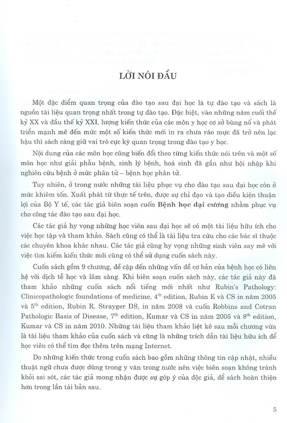 Tuy nhiên, ở trong nước những tài liệu phục vụ cho đào tạo sau đại học còn ở mức khiêm tốn. Xuất phát từ thực tế trên, được sự chỉ đạo và tạo điều kiện thuận lợi của Bộ Y tế, các tác giả biên soạn cuốn Bệnh học đại cương nhằm phục vụ cho công tác đào tạo sau đại học.