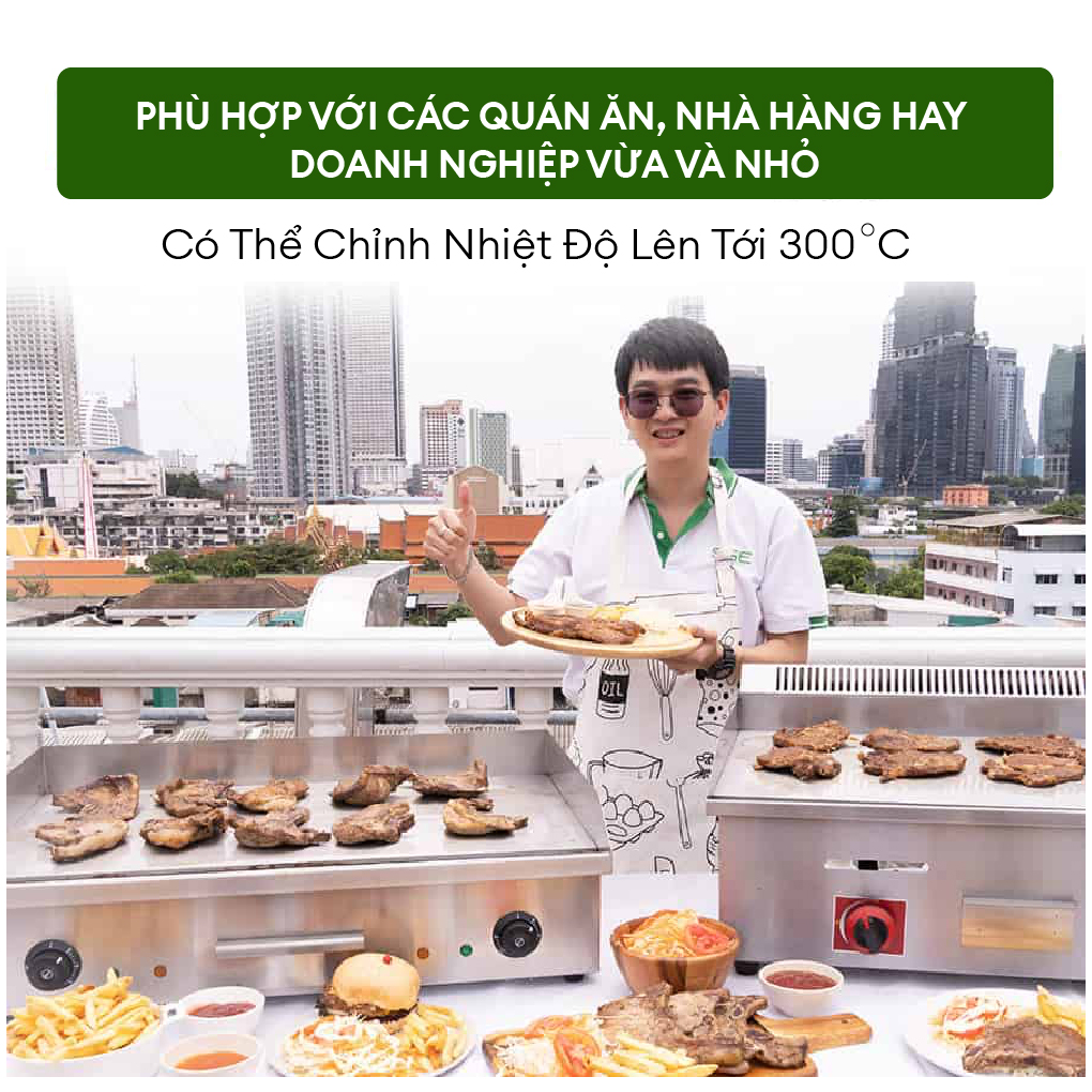 - Hệ thống đánh lửa tự động Spark Magnito dễ sử dụng BẾP CHIÊN NƯỚNG CÔNG NGHIỆP ĐIỆN GDE Bếp chiên nướng điện với 2 đầu đốt, mặt bếp phẳng, giá cả phải chăng, giúp chế biến món ăn đa dạng, rất xứng đáng để đầu tư. Mặt bếp dày 5mm. phân bổ nhiệt đều, làm từ chất liệu bền đẹp, dễ vệ sinh. Hãy bắt đầu công việc kinh doanh với bếp chiên nướng sử dụng điện GDE. KÍCH THƯỚC THỰC TẾ BẾP CHIÊN NƯỚNG CÔNG NGHIỆP ĐIỆN GDE THÔNG SỐ KỸ THUẬT BẾP CHIÊN NƯỚNG ĐIỆN GDE Model GDE55 GDE73 Điện áp sử dụng 220V Nhiệt độ cao nhất 300 độ C 300 độ C Kích thước bếp ( W x L x H) 55 x 42 x 23 cm. 73 x 45 x 23 cm. Kích thước khu vực nướng 54.5 x 30 cm. 73 x 40.5 cm. Trọng lượng 19.5 kg 26 kg TÍNH NĂNG BẾP CHIÊN NƯỚNG CÔNG NGHIỆP ĐIỆN GDE Khay chứa dầu dễ sử dụng, có thể tháo ra được Hệ thống đánh lửa tự động Spark Magnito dễ sử dụng và có thể điều chỉnh nhiệt theo nhu cầu Mặt bếp làm từ tấm thép dày 8mm. độ bền cao, dễ vệ sinh, truyền nhiệt tốt SỬ DỤNG ĐA DẠNG CHẾ BIẾN MỌI THỰC PHẨM Bếp chiên nướng sử dụng điện rất phù hợp để bắt đầu công việc kinh doanh, chắc chắn sẽ đáp ứng được mọi nhu cầu sử dụng. ĐIỀU KIỆN BẢO HÀNH Sản phẩm được bảo hành chính hãng 1 năm kể từ ngày mua hàng Bảo hành đổi mới sản phẩm trong vòng 7 ngày Không nhận bảo hành máy và các thiết bị trên máy khi gặp sự cố do một trong các nguyên nhân sau: