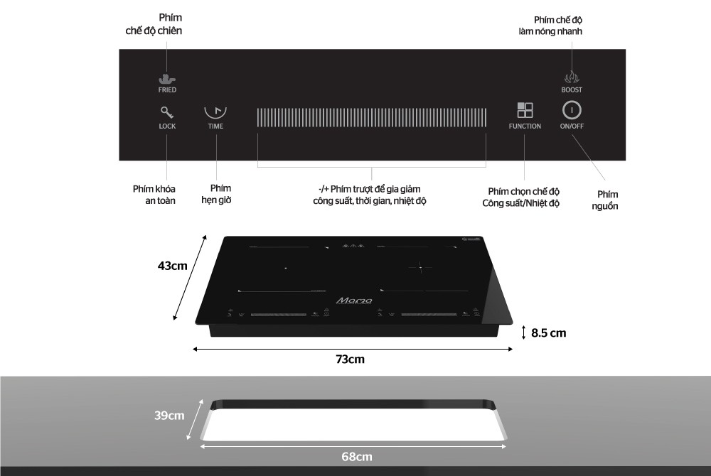 Thông số kỹ thuật + Bếp 02 từ + Mặt kính crystal siêu bền, chịu lực chịu sốc nhiệt + 09 dải công suất + Điều khiển cảm ứng độc lập dạng ẩn trực tiếp