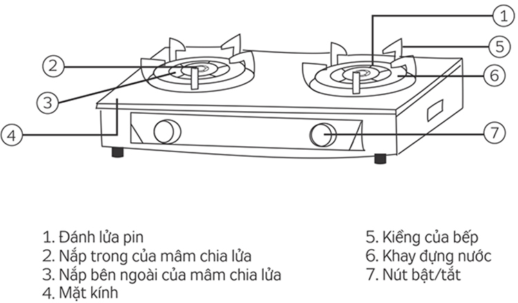 * Mặt kiếng cao cấp chịu lực, chịu nhiệt, thiết kế hoa văn sang trọng; - Thân bếp bằng inox, cao 100 mm; - Kiềng thép sơn tĩnh điện, có chắn gió; - Điếu loe