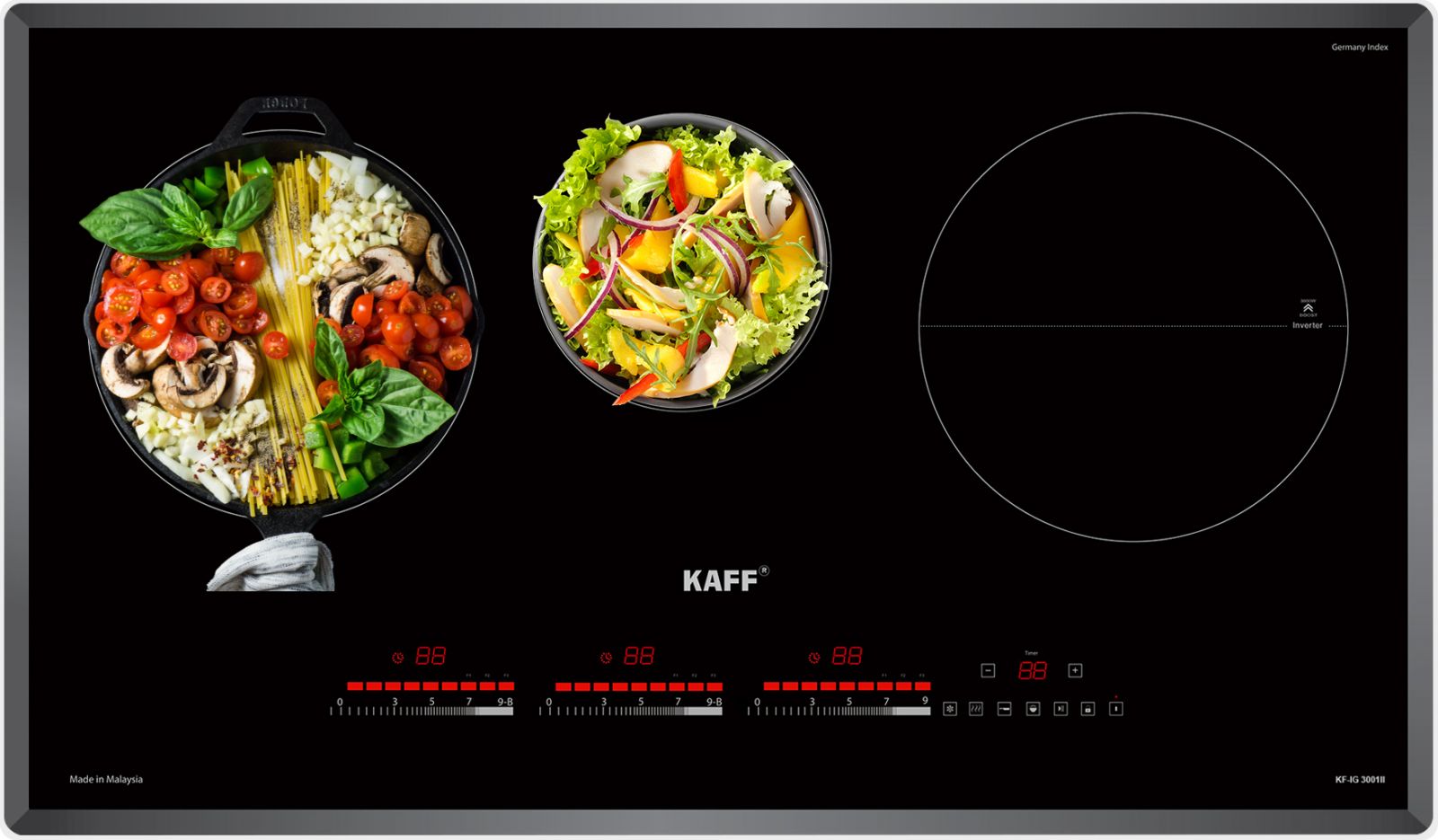 Bếp từ Kaff KF-IG3001II gồm 3 vùng nấu có tổng công suất 5500W, vùng nấu từ lớn bên trái với công suất 1800W có khả năng đun nấu siêu nhanh và tiết kiệm điện năng có thể đạt mức công suất tối đa 2800W, vùng nấu từ nhỏ ở giữa với công suất 1500W có khả năng đun nấu siêu nhanh và tiết kiệm điện năng có thể đạt mức công suất tối đa 2500W và vùng nấu từ lớn bên phải với công suất 2200W có khả năng đun nấu siêu nhanh và tiết kiệm điện năng có thể đạt mức công suất tối đa 3500W. Chức năng nhận diện vùng nấu chỉ sinh nhiệt vùng đáy nồi, tránh nồi thất thoát nhiệt ra ngoài. Chức năng Booster ở vùng từ nấu siêu nhanh, tuy nhiên thời gian tối đa mặc định dùng chức năng này là 10 phút/lần tránh quá tải.