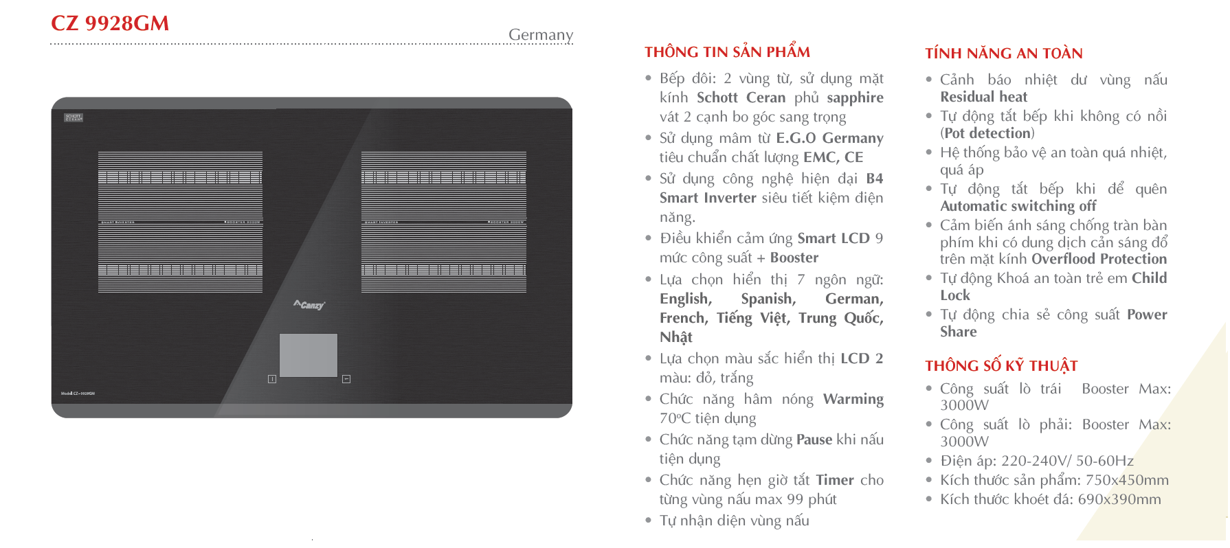 BẾP ĐIỆN TỪ CANZY CZ 9928GM | NHẬP KHẨU NGUYÊN CHIẾC TỪ CHLB ĐỨC | THIẾT KẾ SANG TRỌNG | HỆ ĐIỀU KHIỂN CẢM ỨNG SLIDER CONTROL SIÊU NHẠY | AN TOÀN, BỀN BỈ VÀ TIẾT KIỆM ĐIỆN NĂNG