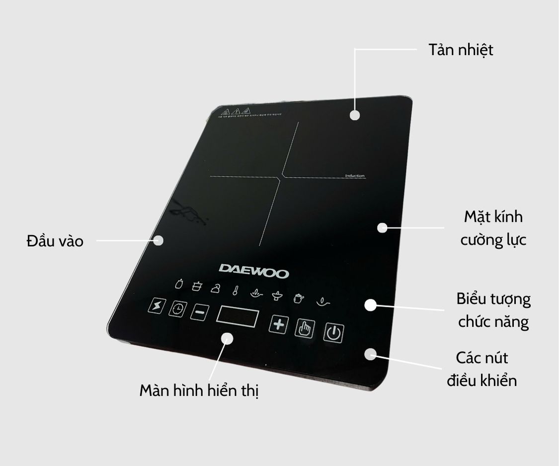 Mặt kính ceramic chịu nhiệt Mâm từ đường kính 22cm Mâm từ tự động nhận biết kích cỡ xoong nồi. Chức năng hẹn giời, chế độ xào rá Điều khiển công suất / nhiệt độ