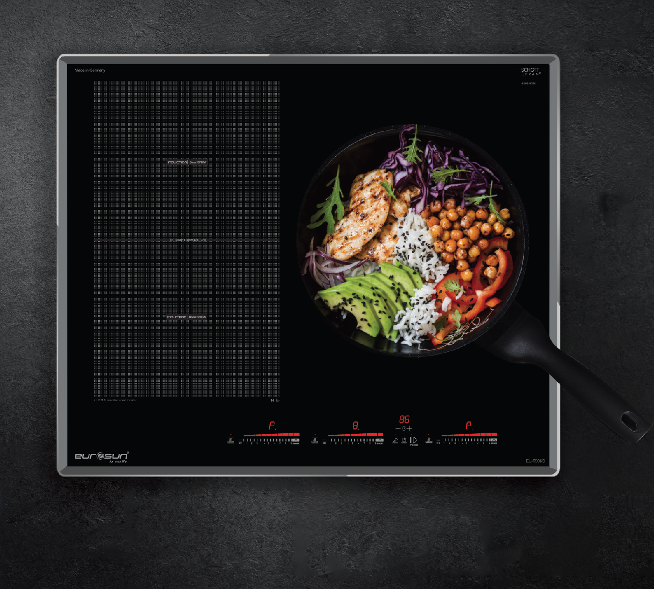 Bếp từ EU- T906G có 3 vùng nấu cảm ứng từ, giúp bạn có thể đồng thời chế biến các món ăn khác nhau một cách nhanh chóng, tiện lợi. Thiết kế tinh tế, tối giản mang phong cách thời thượng. Mặt bếp được thiết kế hình chấm bi hình lưới vuông chống trượt nồi và chống xước mặt kính.