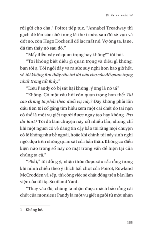 Với sự giúp đỡ của thanh tra Edward Catchpool, Poirot phải tìm ra sự thật giữa một mạng lưới nhằng nhịt các mối quan hệ, những bí mật động trời, những mạng sống bị đe dọa, nhiều lầm lỗi và sự tha thứ. Lắt léo, hấp dẫn, và thông tuệ, một lần nữa Sophie Hannah đã làm sống lại vị thám tử được yêu thích nhất mọi thời đại.