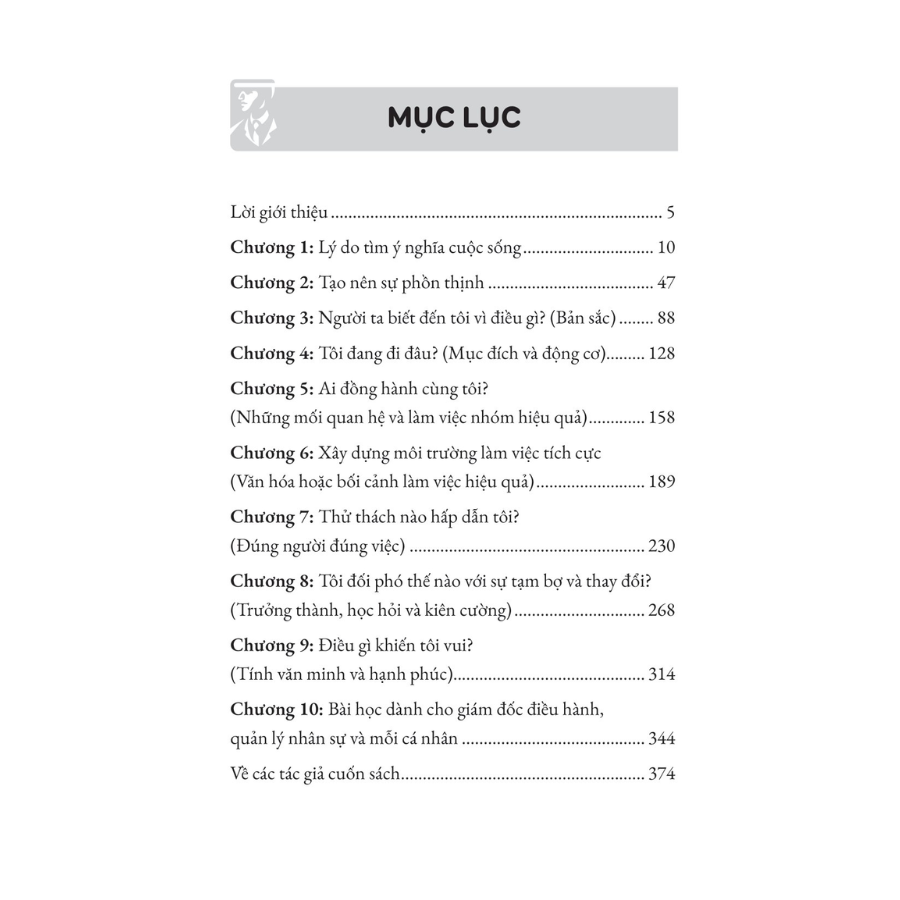 Trong cuốn sách này, tác giả không chỉ dừng lại ở những trường hợp cụ thể mà còn tổng hợp nhiều học thuyết, nghiên cứu và trải nghiệm từ nhiều nguyên tắc để đưa ra 7 động cơ ý nghĩa mà các nhà lãnh đạo thành công đã sử dụng để tạo ra ý nghĩa của cuộc sống, của công việc. Những ví dụ, những nguyên tắc và những bảng tự đánh giá theo thang điểm nhằm giúp các nhà lãnh đạo tạo ra ý nghĩa cho nhân viên và biến nó thành sự phồn thịnh bền vững của tổ chức.