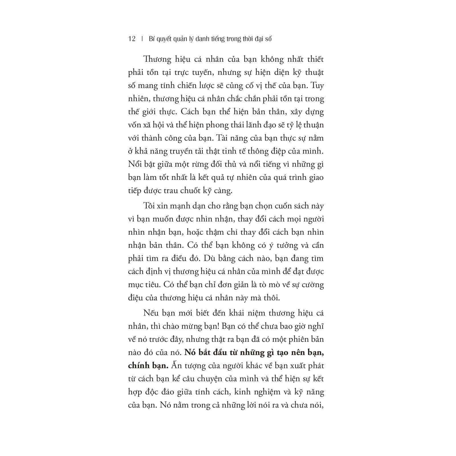 Có thể coi Bí quyết quản lý danh tiếng trong thời đại số là cuốn cẩm nang hướng dẫn độc giả xác định câu chuyện thương hiệu của riêng mình dựa trên kinh nghiệm, đam mê và mục tiêu nghề nghiệp.