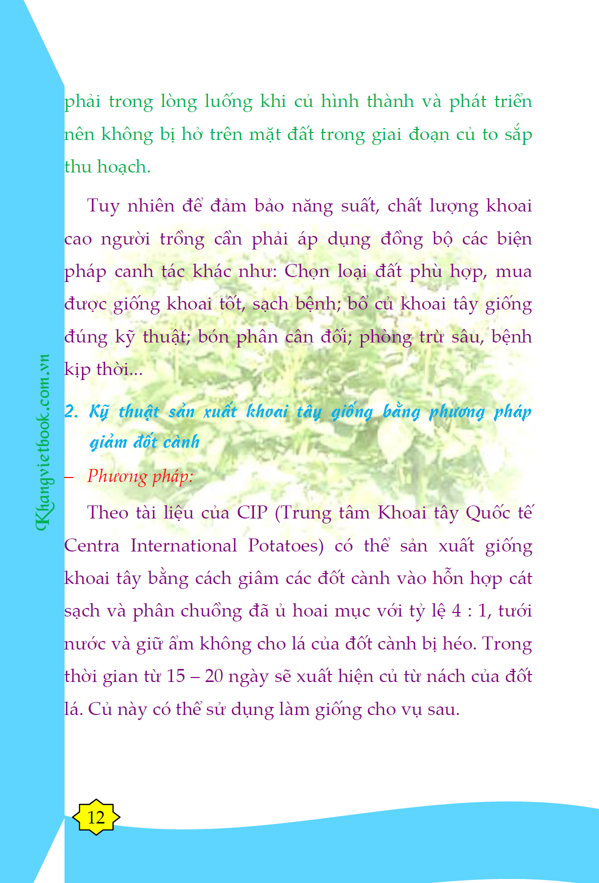 Bí Quyết Thành Công Kĩ Thuật Trồng Khoai Tây Hiệu Quả   Nước ta có gần 70% dân số sống ở khu vực nông thôn. Phát triển kinh tế nông thôn được xem là yếu tố quan trọng đảm bảo sự phát triển bền vững của quốc gia. Sau gần 15 năm thực hiện đổi mới kinh tế, nông nghiệp và phát triển nông thôn Việt Nam đã đạt được những bước tiến quan trọng. Đổi mới trong nông nghiệp đã mở đầu cho nền kinh tế ở Việt Nam, tạo nền tảng vững chắc giúp Việt Nam phát triển kinh tế. Trong thời gian qua, nhiều giống cây trồng, vật nuôi và thủy hải sản được tạo ra, nhất là một số giống có ưu thế đã đưa vào sản xuất trên diện rộng, góp phần tăng năng suất, chất lượng, hiệu quả sản xuất và sức cạnh tranh cho nông sản Việt Nam. Đến nay đã có trên 90% diện tích lúa, 80% diện tích ngô, 60% diện tích mía, cây an quả được dùng giống mới. Đã có 90 cây trồng được chọn tạo như: Nhãn, vải, bưởi, xoài, chuối, dứa, dưa hấu, nấ, đưa tỉ trọng áp dụng giống tiến bộ kỹ thuật trong sản xuất nông nghiệp lên 35%. Đối với chăn nuôi, nhiều công thức lai tạo giống lợn được công nhận đưa vào nghiên cứu và sản xuất đại trà, điển hình là lợn 3 máu và 4 máu ngoại của các dòng cao sản (Landrace, Yorshire, Pietrain, Duroc), bò sữa, bò thịt, dê, gà Riêng đối với thủy sản, đã áp dụng có hiệu quả công nghệ nhân giống nhân tạo một số loại thủy sản có giá trị kinh tế cao như tôm sú, tôm hùm, cá tra, ba Nông nghiệp là một ngành kinh tế quan trọng trong quá trình phát triển của mỗi quốc gia. Nước ta đi lên chủ nghĩa xã hội từ một nước nông nghiệp lạc hậu, gần 80% dân số ở nông thôn. Vì vậy, phát triển nông nghiệp – nông thôn là vấn đề có tầm chiến lược quan trọng cả về kinh tế, chính trị, xã hội và môi trường sinh thái. Để giúp bạn đọc tham khảo, vận dụng vào chăn nuôi, trồng trọt đạt hiệu quả, chúng tôi giới thiệu bộ sách gồm  những nội dung về các giống vật nuôi, cây trồng, khả năng sản xuất và kỹ thuật chăm sóc nuôi dưỡng cũng như các biện pháp phòng trị bệnh. Hy vọng bộ sách sẽ đồng hành cùng bạn.