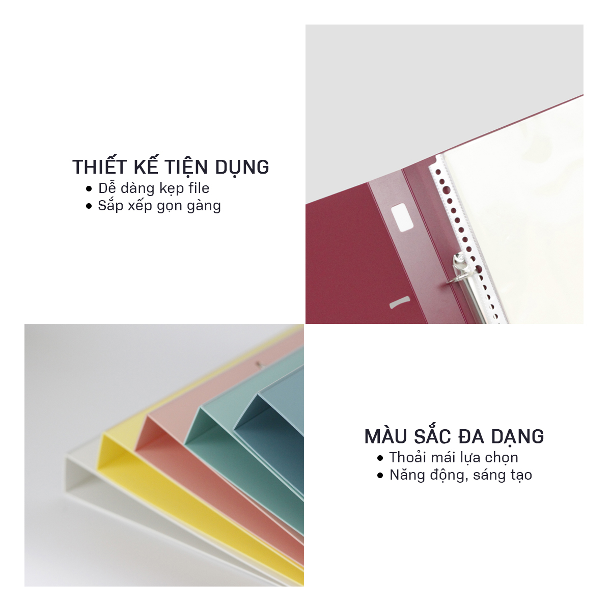 ĐẶC TÍNH NỔI BẬT: - 4 còng chữ O giúp túi tài liệu ngay ngắn (dễ sử dụng, phù hợp với nhiều loại túi 30 lỗ, túi 11 lỗ) - Bìa nhựa PP dày dặn,