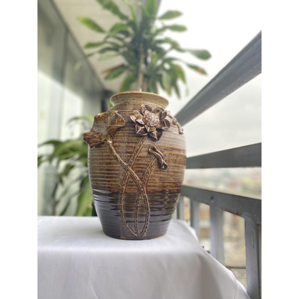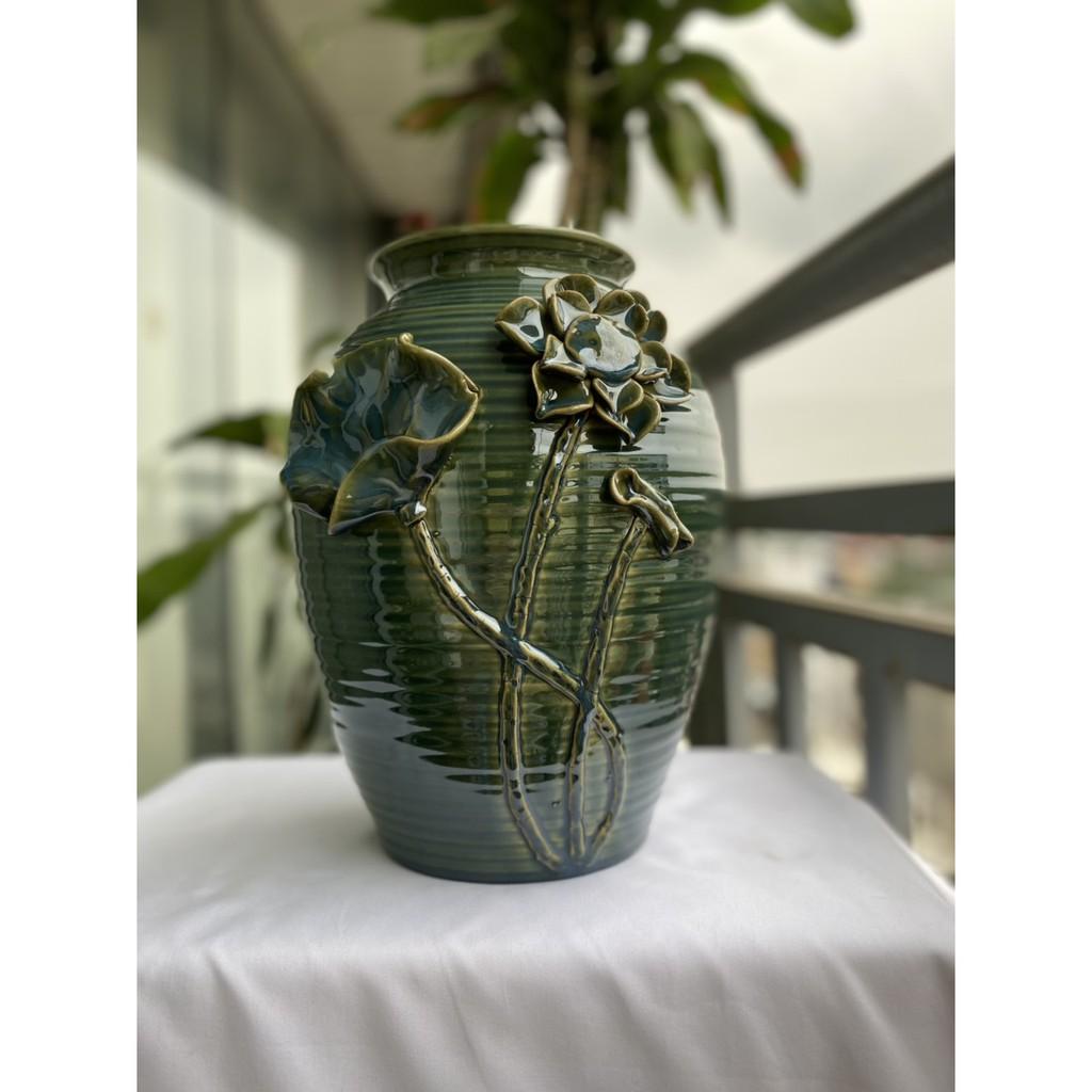 Mua tại TiktokBình hoa cao cấp Bát Tràng, hàng chuẩn loại 1, dáng chum họa tiết đắp nổi được thực hiện thủ công 100% bởi bàn tay lành nghề của các nghệ nhân làng nghề. Sản phẩm với màu men xanh rêu độc đáo, nước men sáng loáng, bóng mịn có thể soi gương được. Bình hoa phù hợp với nhiều loại hoa khác nhau, dễ dàng trưng bày ở nhiều không gian khác nhau như phòng khách, phòng làm việc, phòng ngủ, văn phòng công ty, cửa hà giúp tạo nên một không gian trang nhã, sang trọng, đẳng cấp. Sản phẩm cao 33cm, miệng bình 14cm, vòng bụng bình 73cm
