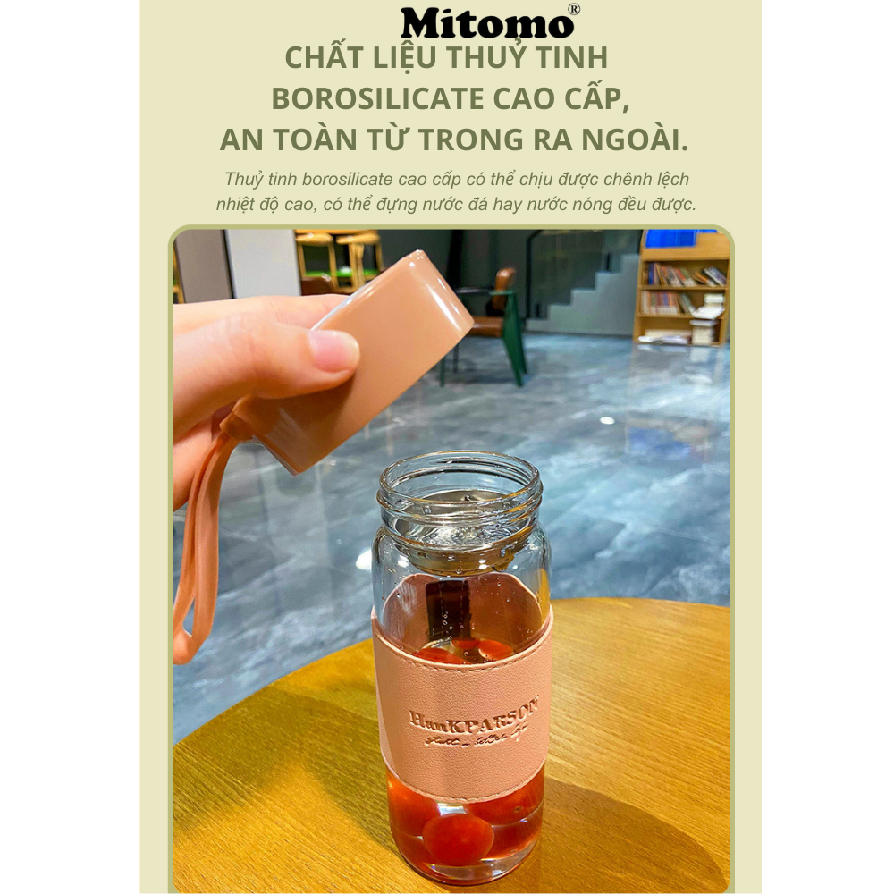 ✨Bình Nước Thủy Tinh Cao Cấp Bọc Da Mitomo, Chịu Lực, Chịu Nhiệt, Có Dây Đeo Kèm Bộ Lọc Inox 304 Dung Tích 500ML hàng chính hãng