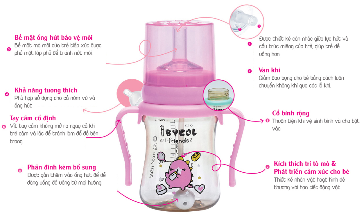 - Ống hút được gắn liền vào bình để trẻ có thể dễ dàng uống ở mọi góc độ.