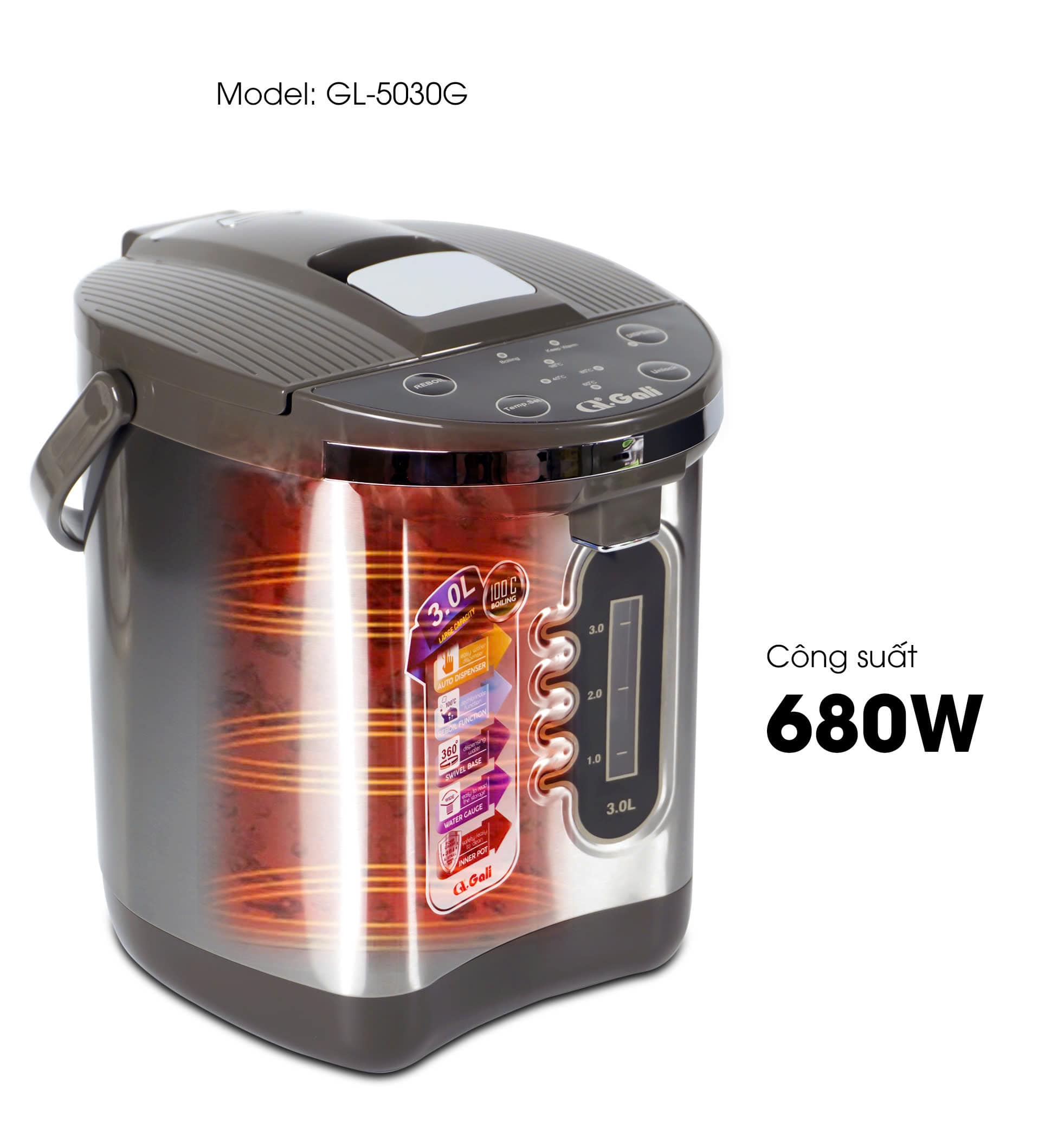 Gali xin giới thiệu Bình Thuỷ Điện GL-5030G - Dung tích 3 lít, công suất 680w/220Vac-50Hz. - Cấu tạo 2 lớp chống nóng, vỏ ngoài inox sang trọng, thân trong inox 304 không phôi nhiễm,