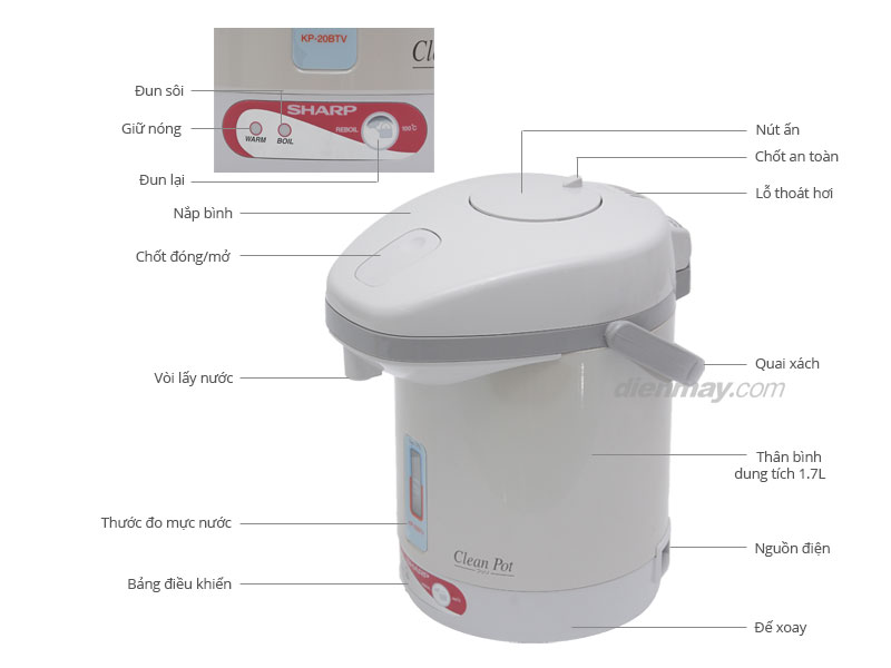 Bình thủy điện Sharp KP-20BTV với thiết kế đẹp mắt cùng dung tích 1.7 lít Đáp ứng đủ nhu cầu nước nóng cho cả gia đình bạn để pha trà, nấu mì, pha cà phê,