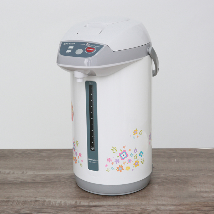Thiết kế hiện đại Bình Thủy Điện Sharp KP-Y40PV-CU (4.0 Lít) - Hàng Chính Hãng màu trắng trang nhã, hoa văn trẻ trung, trang trí nhẹ nhàng cho không gian nội thất Bình dung tích 4 lít dùng tốt cho gia đình, văn phòng… đun nước nhanh sôi với công suất 700W Ruột bình bằng thép không gỉ phủ chống dính Poly-Flon chất lượng cao, đun nước an toàn, dễ vệ sinh giúp tránh đóng cặn Dễ sử dụng với bảng điều khiển nút nhấn điện tử, rót nước bằng bơm tay đơn giản Bình đun sôi nước ở 100 độ C, có chế độ tự đun sôi lại khi nước nguội, giữ ấm liên tục ở 90 độ C trong tình trạng được cấp điện Sử dụng bình thủy điện an toàn hơn với khóa rót nước, tránh nóng bỏng do bất cẩn, kèm thêm chế độ tự ngắt khi cạn nước tránh chập cháy Bình với thang đo hiển thị mực nước tiện theo dõi nước sử dụng và khi cần châm thêm nước vào bình Sử dụng bình thủy điện an toàn