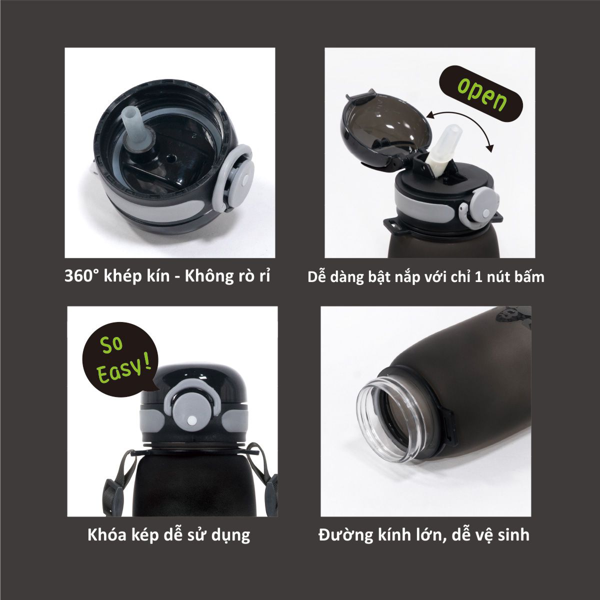 - Chất liệu cấp thực phẩm FDA, không chứa BPA, an toàn cho sức khỏe của bé; - Một chạm để mở - Sử dụng nút nhấn để mở chỉ bằng một tay, giúp bé