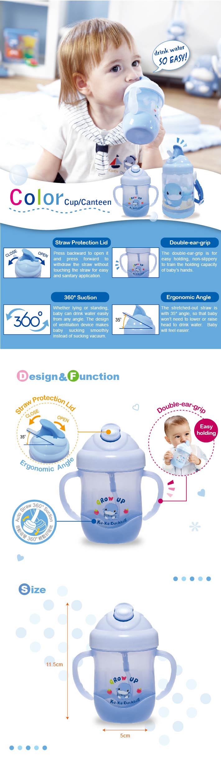 Bình Uống Nước Ống Hút Có Tay Cầm KuKu KU5452A thích hợp dùng cho các bé từ 6 tháng tuổi trở lên tập chuyển từ cách vận động môi bú mút sang động tác hút nước một cách thuần thục và dễ dàng. Vận động tay của bé cũng trở nên linh hoạt hơn khi bé cầm nắm bình để tập uống mỗi ngày.