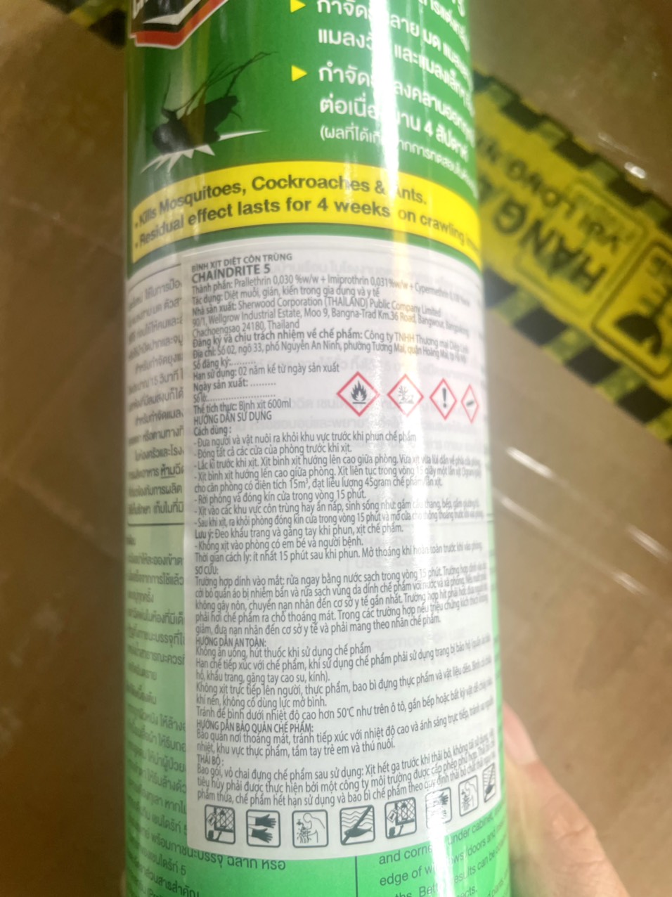 Mua tại Tiktok● Thương hiệu : CHAINDRITE ( THÁI LAN ) ● Nhà sản xuất: Sherwood Corporation ( THÁI LAN ) Public Company Limtied ● Đăng ký và chiệu trách nhiệm về chế phẩm: Công ty TNHH Thương mại Diệp Linh - Việt Nam địa chỉ: Số 02, ngõ 33, phố Nguyễn An Ninh, phường Tương Mai, quận Hoàng Mai, tp Hà Nội ● Dung tích: 600ml ● Phân loại : CHAINDRITE 5 ( diệt muỗi, gián, kiến và côn trùng), CHAINDRITE 3 (chuyên diệt Mối/Mọt/Gián/Kiến/Kiến ba khoang/Côn Trùng ) ● Nổi bật : Bình xịt CHAINDRITE thương hiệu số một tại Thái Lan nên rất An Toàn Cho Người Sử Dụng,Có tác dụng trong 4 tuần kể từ lúc xịt.