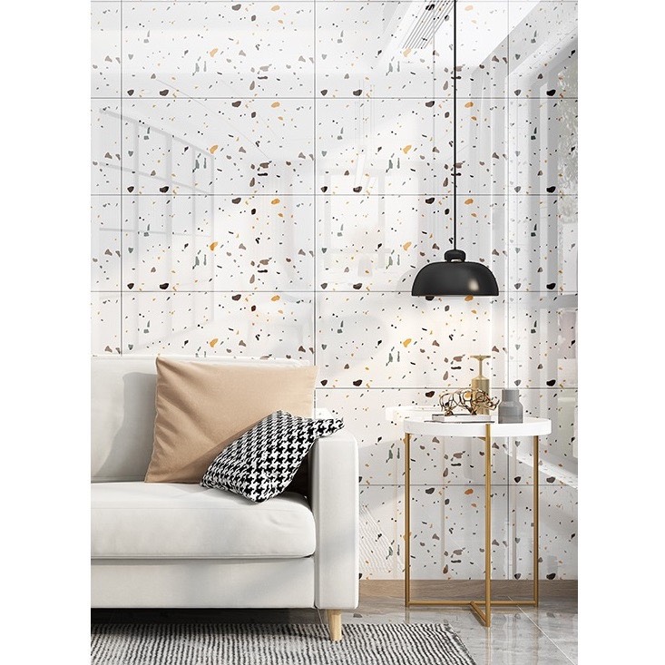 Mẫu giấy dán tường giả đá hoa cương màu trắng này có sẵn keo rồi, khách chỉ cần lột ra dán thôi. Chất liệu bền đẹp, không bám bụi, có thể lau chùi bằng xà