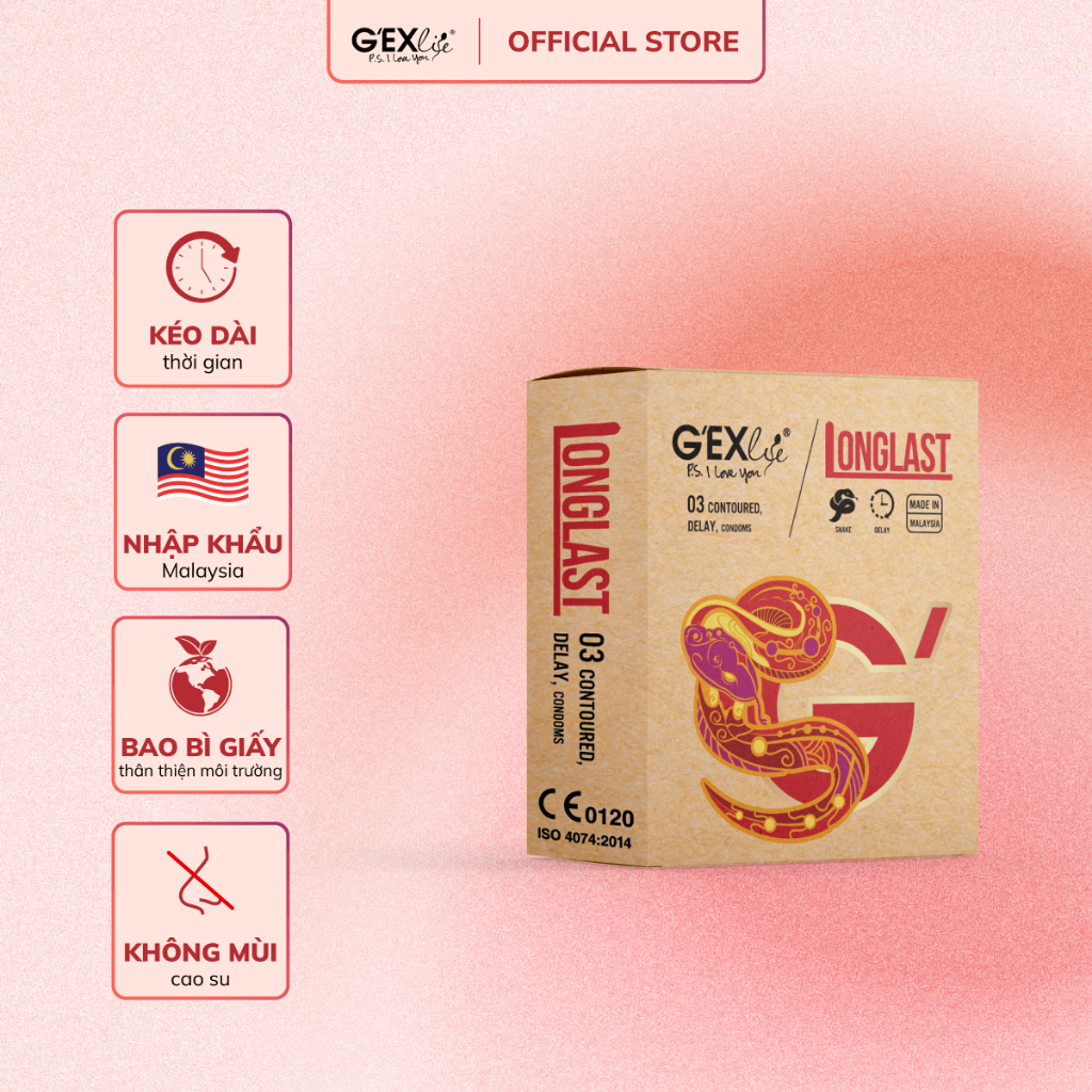 - BCS sản xuất tại nhà máy BCS Top thế giới tại Malaysia. CÔNG DỤNG Thiết kế ôm sát kết hợp với Benzocaine, G’EXlife LONG LAST không chỉ tạo cảm giác thoải mái mà còn kéo dài thời gian quan hệ, mang lại sự thăng hoa một cách rất tinh tế và tự nhiên. THÀNH PHẦN CHÍNH: Cao su thiên nhiên trong suốt ĐỐI TƯỢNG SỬ DỤNG: Dành cho người từ 18 tuổi trở lên. HƯỚNG DẪN SỬ DỤNG:
