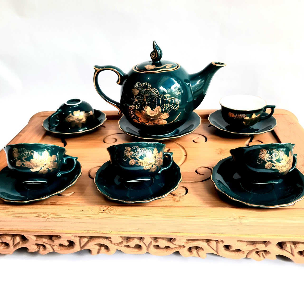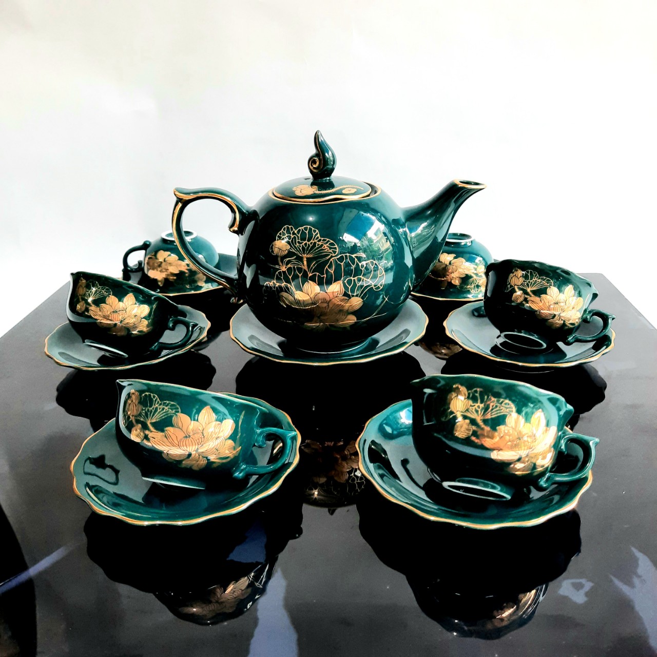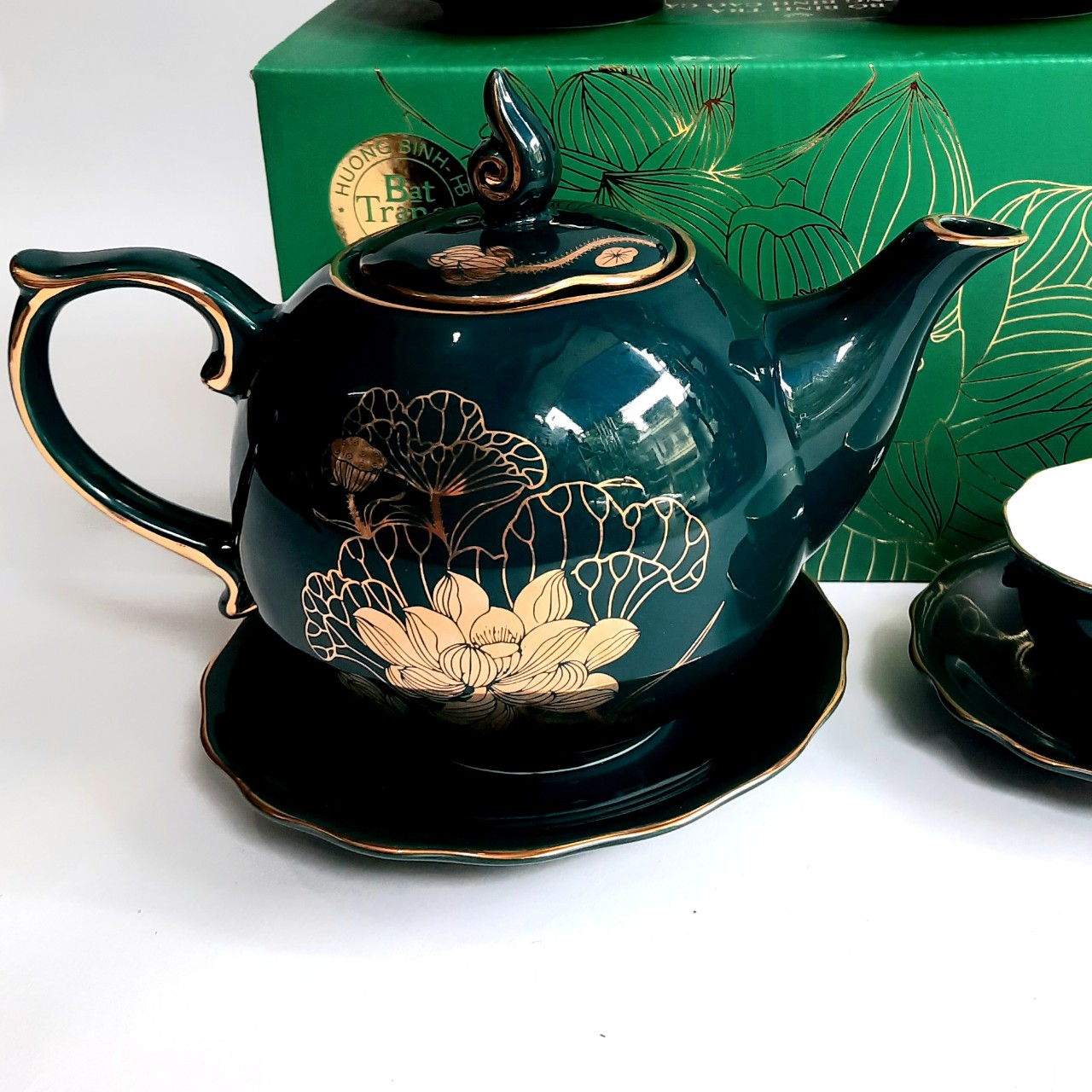 Bộ ấm chén Bát Tràng phú quý men xanh lục ngọc bảo họa tiết Phúc - Lộc - Thọ vẽ vàng 24k - Là sản phẩm hội tụ được nét tinh xảo của bàn tay