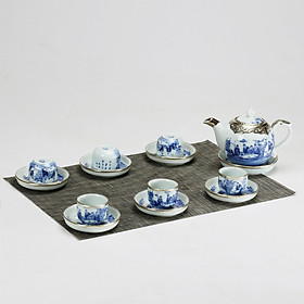 Bộ ấm chén Bát Tràng - Sản phẩm bao gồm: 1 Ấm, 6 chén, 7 đĩa kê - dung tích ấm 350ml - Chất liệu: Gốm men lam Bát Tràng bọc đồng. - Bộ ấm
