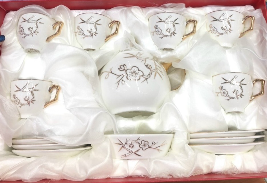 Mua tại TiktokBộ ấm chén trà bằng sứ cao cấp có khả năng chịu nhiệt, giữ nhiệt tốt và rất an toàn cho người sử dụng. Hộp xốp và giấy bảo vệ đẹp Hoa văn trang nhã và giản dị. Bộ bình cốc sứ cao cấp: Chất liệu sứ sáng , bóng, mỏng và rất nhẹ. Không có họa tiết sử dụng kim loại nên an toàn về sức khỏe. Với những đường nét tinh tế và sang trọng trong thiết kế rất tiện lợi với kiểu dáng đẹp Sử dụng làm điểm nhấn nội thất phòng khách, phù hợp cho mọi gia đình hoặc các doanh nghiệp. Dùng làm quà tặng năm mới, là món quà mừng tân gia ý nghĩa và sang trọng Chất liệu: Sứ dày dặn, chất men sáng mịn, viền vàng.