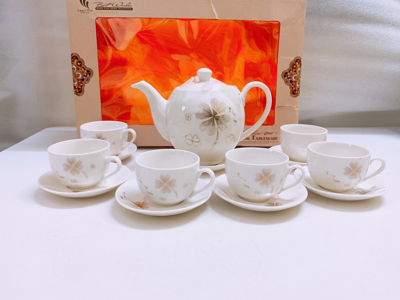 Một bộ sản phẩm bao gồm: 01 ấm, 01 đĩa ấm, 06 chén và 06 đĩa chén.    Bộ sản phẩm được làm từ chất liệu gốm cao cấp, bảo đảm an toàn vệ sinh