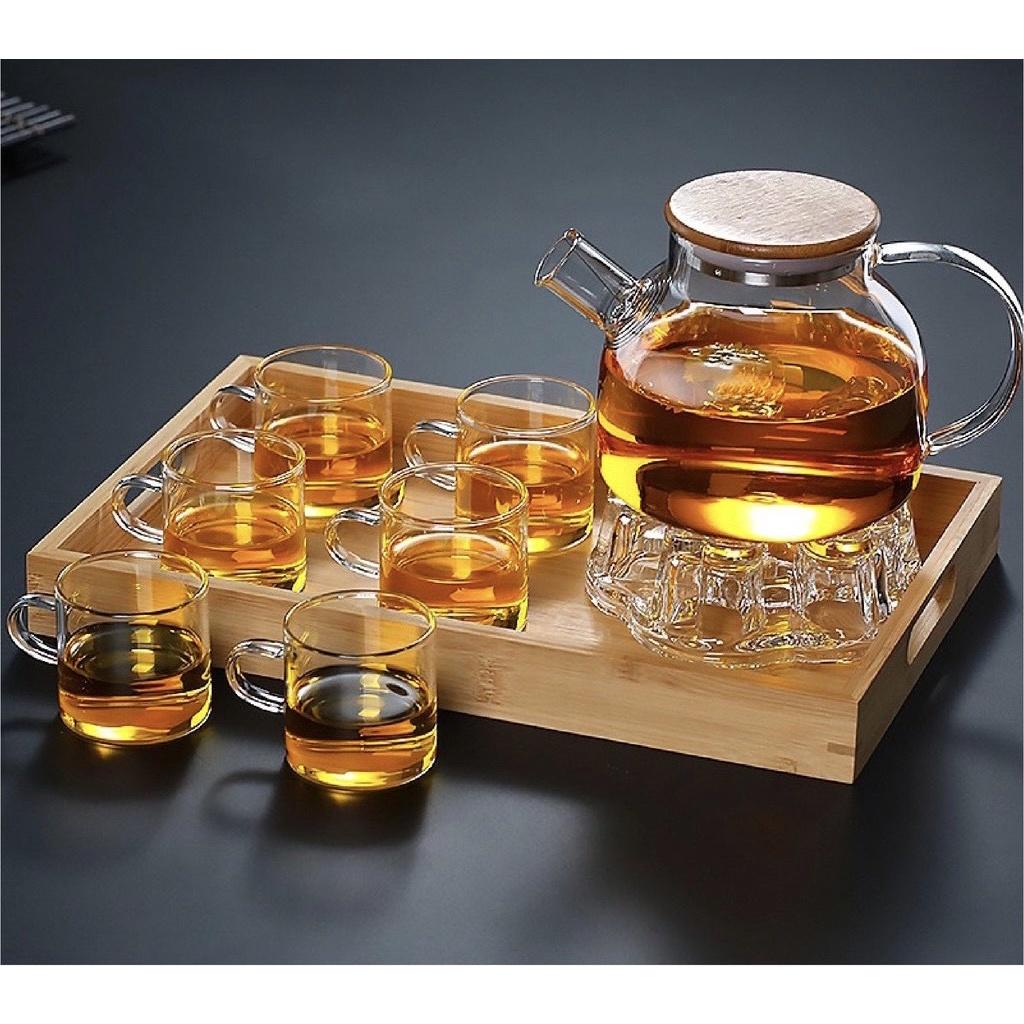 ✨Bộ ấm chén pha trà thuy tinh chịu nhiệt cao cấp nắp gỗ kèm khay tre và đế châm nến