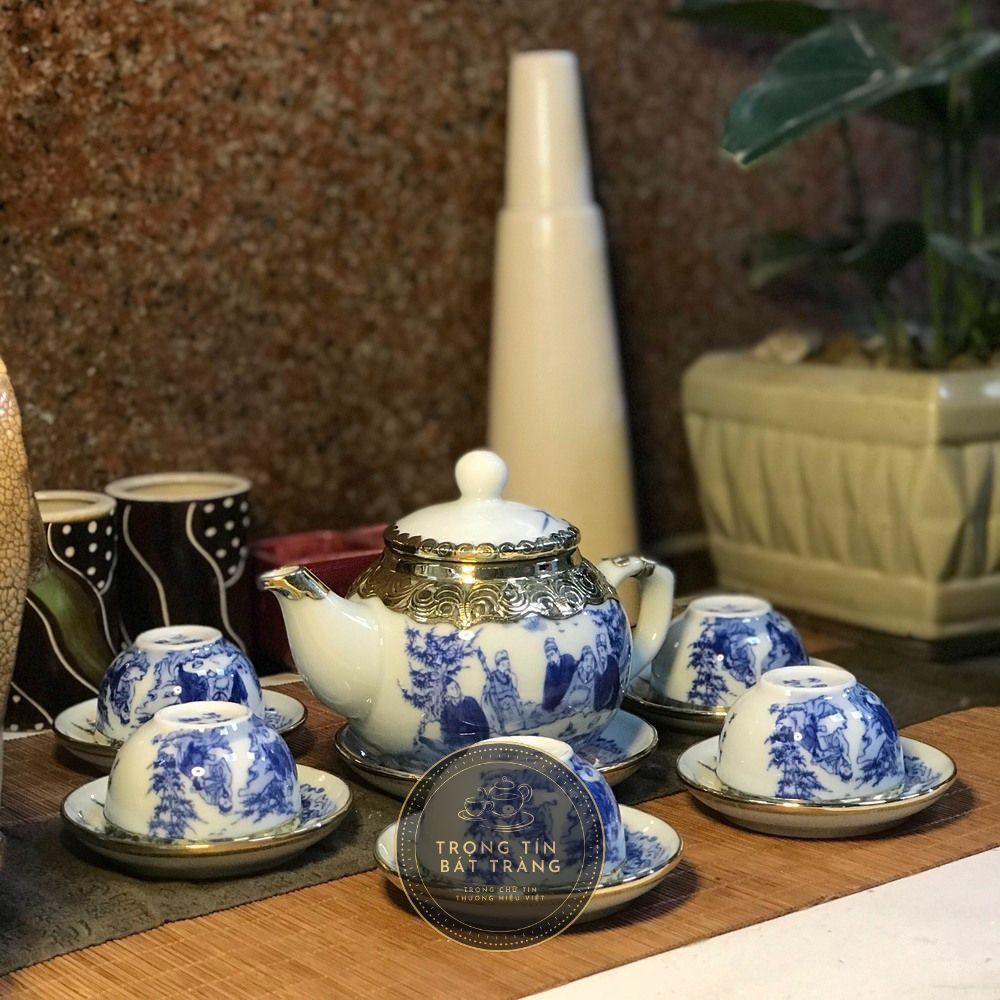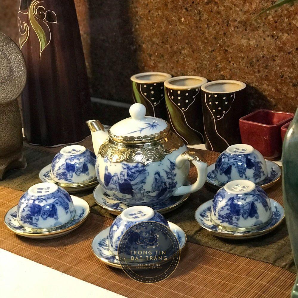 Bộ ấm trà men lam trắng bát tràng được vẽ họa tiết cổ với tích “trúc lâm thất hiền” là một trong những bộ ấm trà thông dụng của làng cổ Bát Tràng. Họa tiết