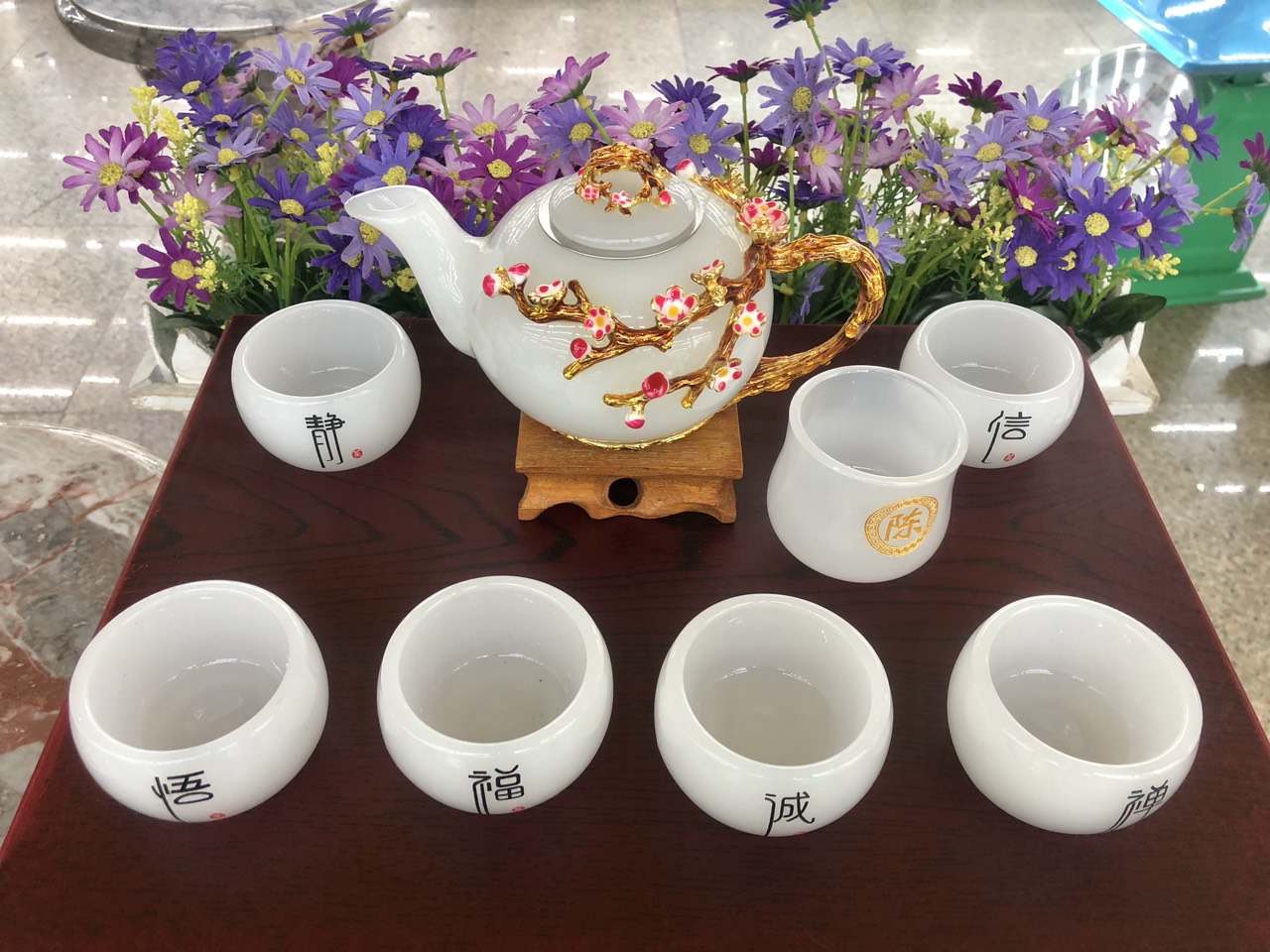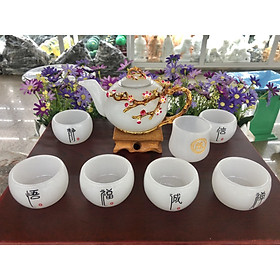 ✨Bộ ấm trà chạm hoa mai với ly chạm chữ đá bạch ngọc