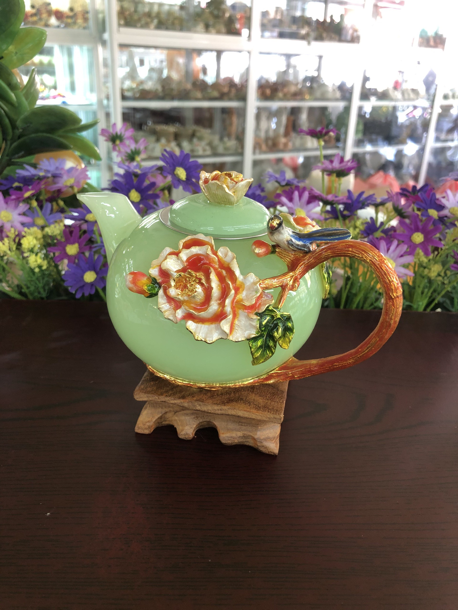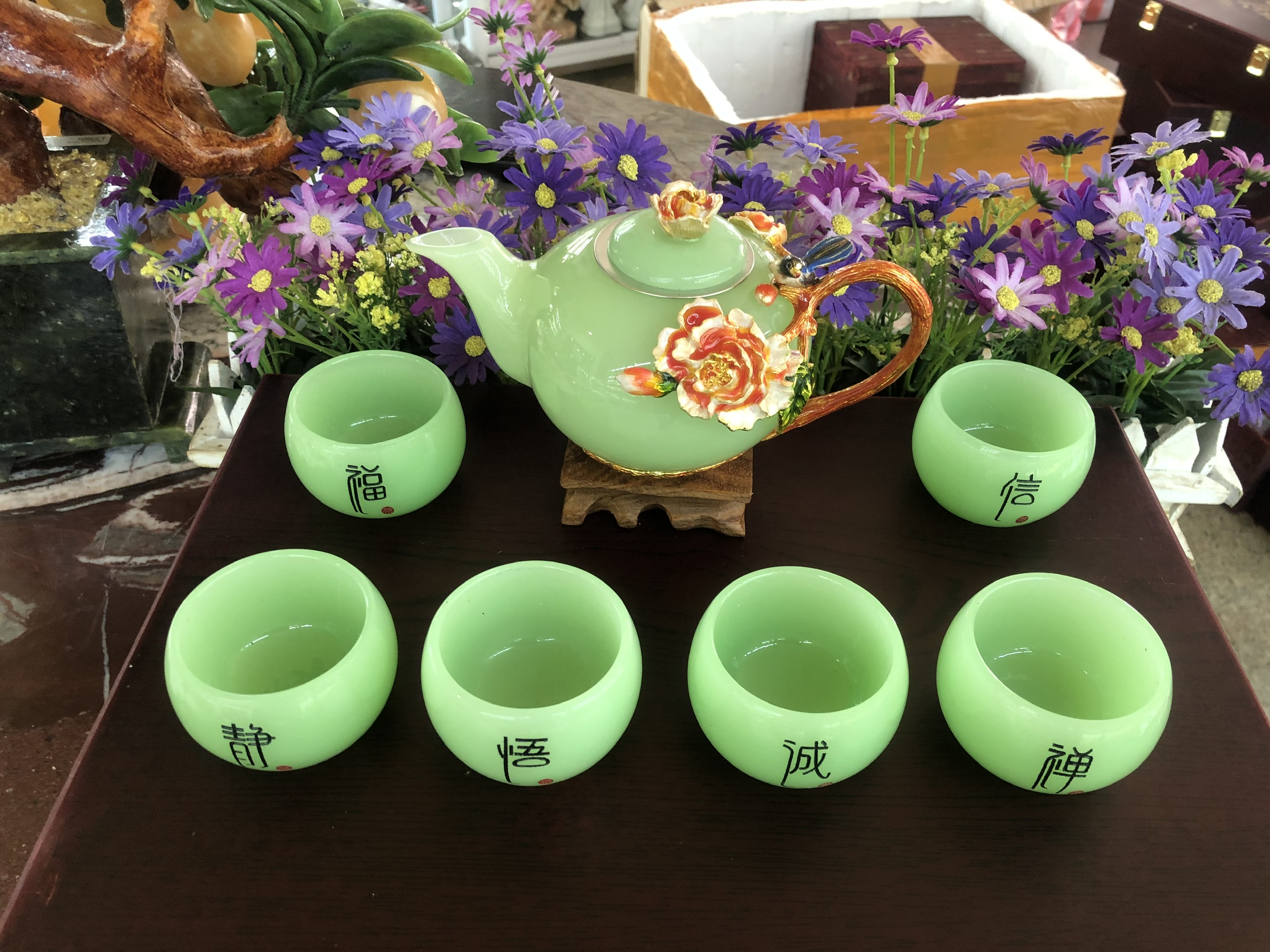 ✨Bộ ấm trà chạm hoa mẫu đơn và chim với ly chạm chữ đá ngọc cẩm thạch xanh