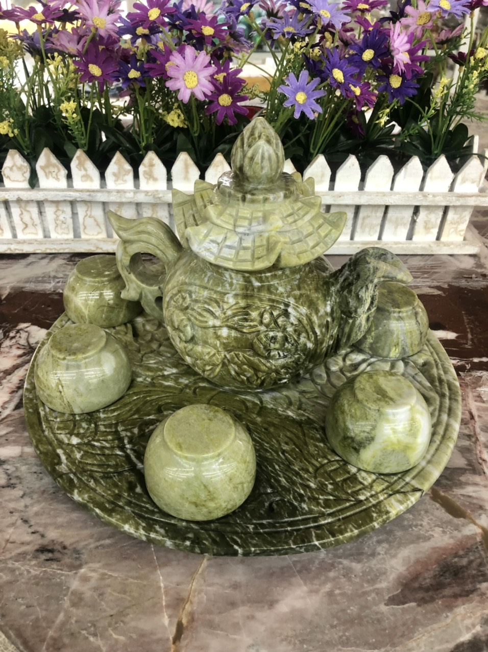 Bộ ấm trà tạc từ ngọc serpentine nguyên khối | 0918979468 - Đá Quý Trungroup