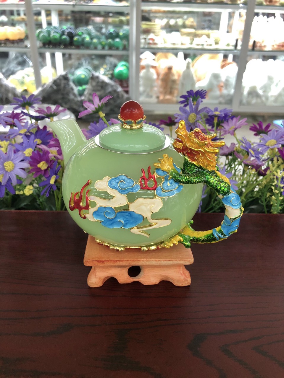 ✨Bộ ấm trà chạm rồng với ly chạm chữ đá ngọc cẩm thạch xanh