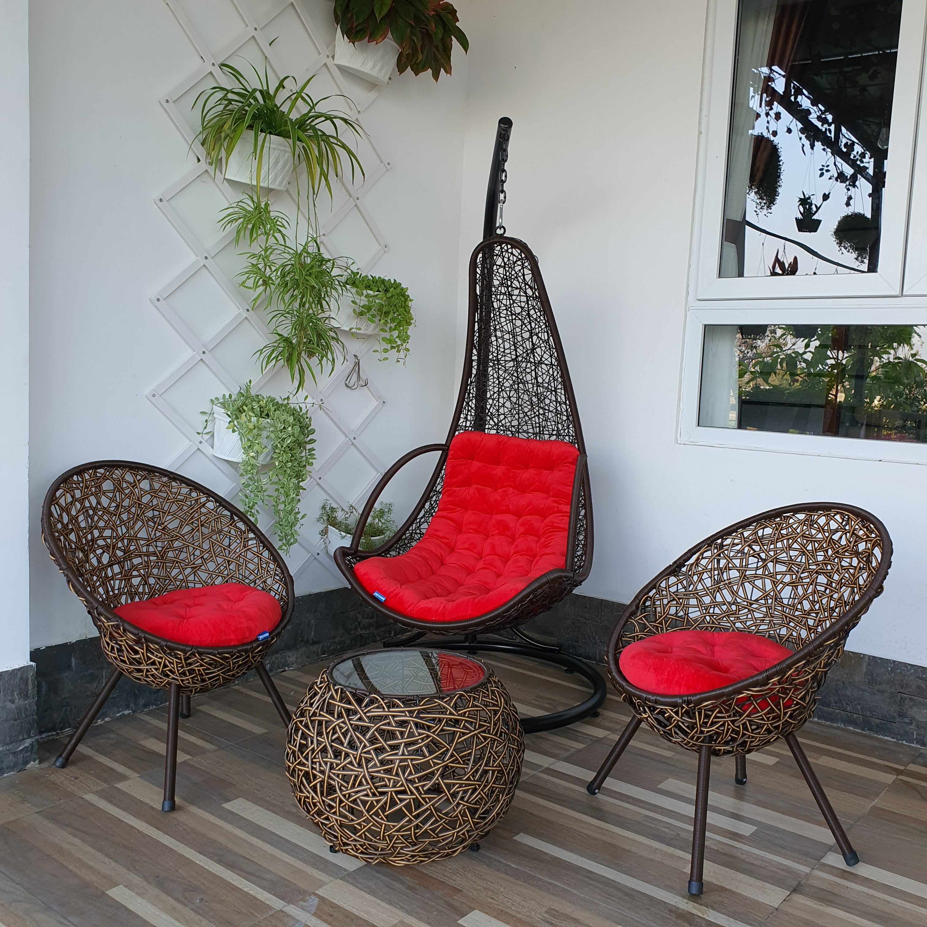 Bộ sản phẩm gồm : 01 bàn mặt kính + 02 ghế + 01 xích đu như hìnhĐặc biệt kèm theo bộ nệm xích đu + 02 đệm ghế chất liệu vải nhung màu sắc như hìnhChất liệu : sắt được tĩnh điện và được gia công sợi gi...