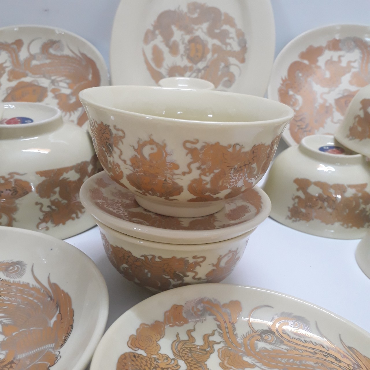 Mua tại TiktokBỘ BÁT ĐĨA THỜ CÚNG ĐẦY ĐỦ GỒM CÁC CHI TIẾT SAU: 6 bát cơm nhỏ rộng 10 cm, cao 4 cm kèm 1 bát nước chấm nhỏ hơn chút xíu. men mầu Vàng Họa tiết của bộ này có viền kim loại ở himhf tượng Rồng Phượng như sau 6 đĩa tròn có kính thước to nhỏ khác nhau và 1 đĩa bầu dục. 2 bát tô nhỏ đựng canh kèm 1 âu đựng cơm có nắp đậy xinh xắn. Tất cả cho vào 1 hộp giấy sang gọn chắc chắn có ghi nơi sản xuất và nguồn gốc xuất sứ rõ ràng. Shop tặng thêm 1 bộ đũa thờ gỗ họa tiết Song Long và bộ chén đĩa thờ cúng Bộ bátđĩa thờ cúng bằng sứ men lam hoa tiết Rồng Phượng chi tiết, tinh xảo và thê lớp viền kim loại để thêm phần linh thiêng. Đây là vật dụngvô cùng cần thiết khi dâng cúng tổ tiên, thần linh trong các ngày lễ tết giỗ chạp.