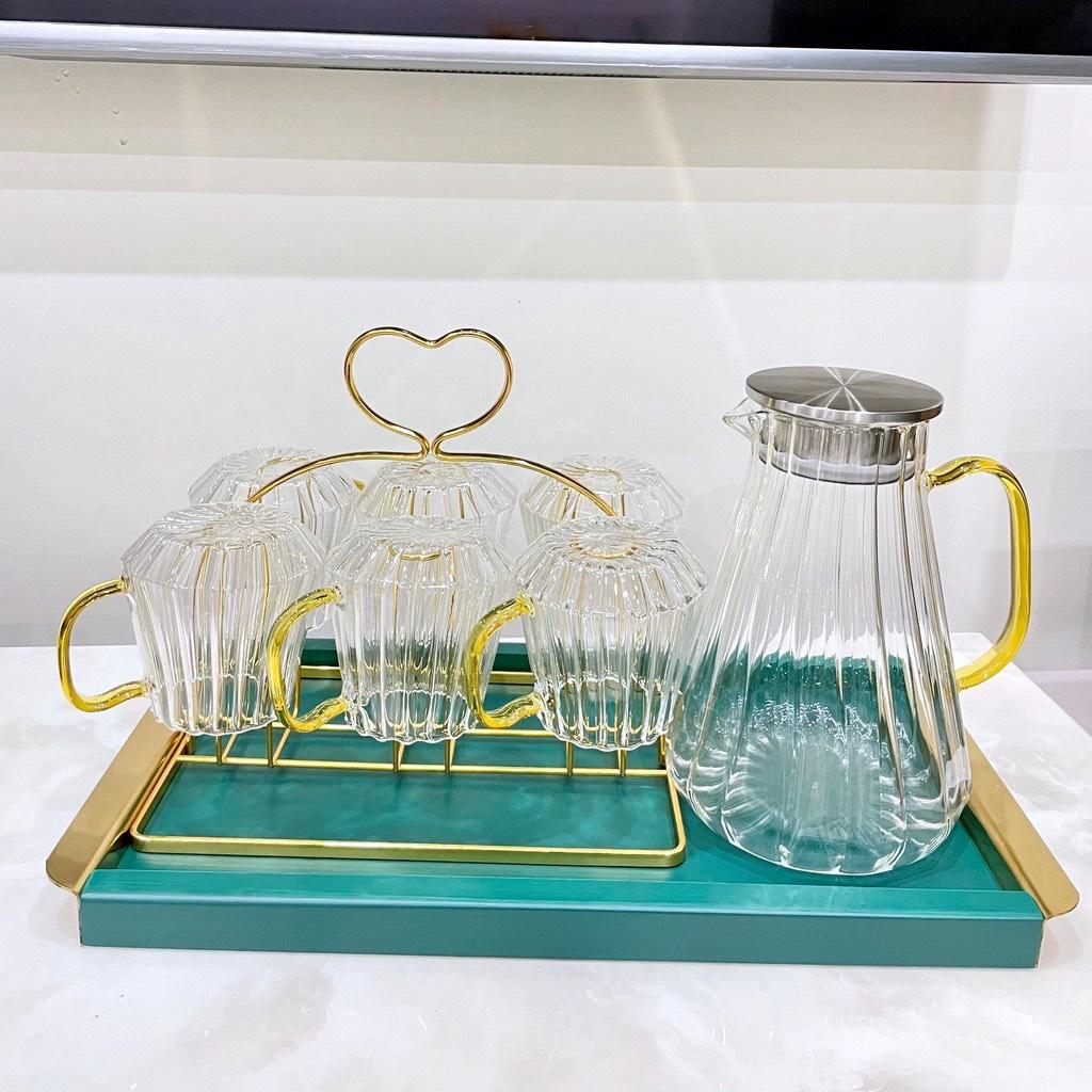 ✨BỘ BÌNH ĐỰNG NƯỚC UỐNG THỦY TINH VÂN SỌC KÈM 6 CỐ KHAY VÀ GIÁ ÚP