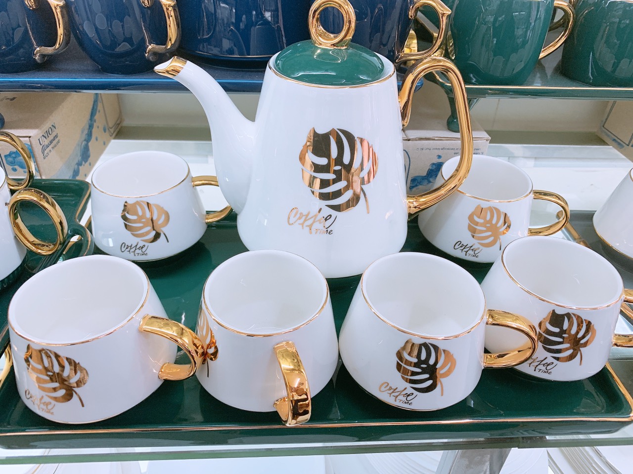 Bộ ấm chén kèm khay sứ pha trà cà phê siêu sang cho ngày Tết- Bộ cốc chén pha trà cà phê kèm khay bằng sứ