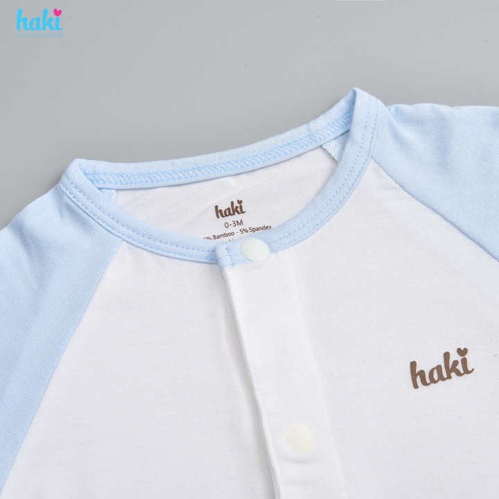 Haki sử dụng 100% cúc bấm nhập khẩu từ Nhật, mịn, lì và chắc chắn tuyệt đối. Điều này giúp ba mẹ dễ dàng thao tác khi thay trang phục cho bé, đồng thời để bé thoải mái khi lẫy, bò mà chẳng lo cứng cộm.
