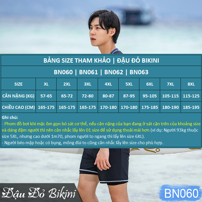Bơi lội tự tin thỏa thích cùng bộ bơi nam tính, phom big size rộng rãi BN060Bảng size tham khảo:Giới thiệu sản phẩm:Áo thun bơi cộc tay che nắng tốt mà vẫn thoải mái vận động.Quần 2 lớp dày dặn,...