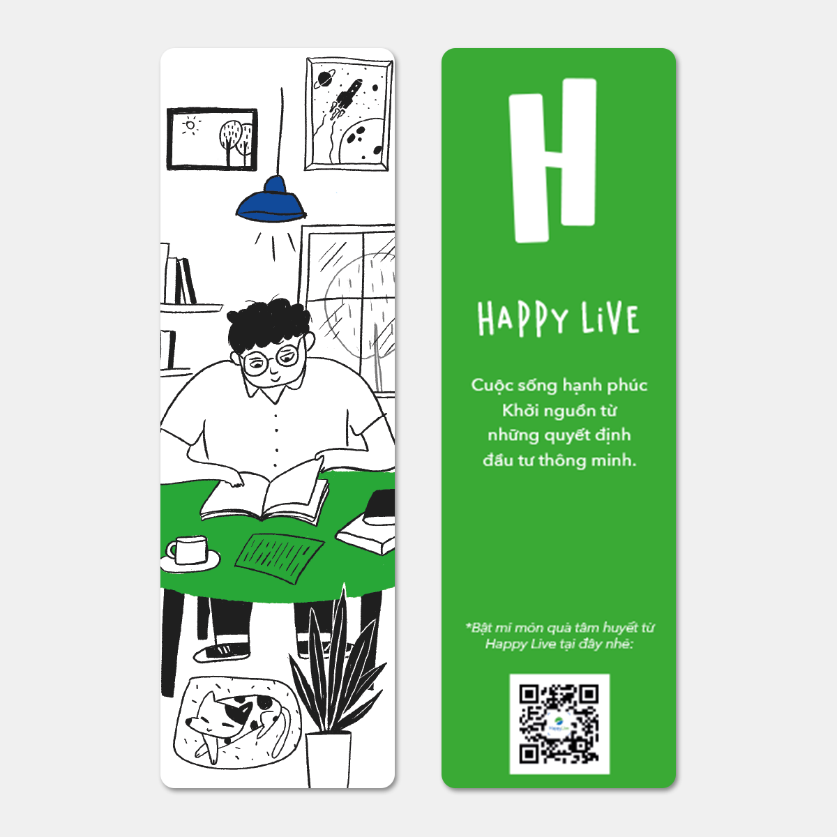 Bộ Bookmark 1% tinh hoa Happy Live gồm 9 bookmarks tương ứng với ý nghĩa mỗi chữ cái trong H.A.P.P.Y L.I.V.E. Bên cạnh đó còn có thêm “phần quà bí mật” đang chờ bạn khám phá bằng cách quét QR Code được in trên chiếc bookmark.