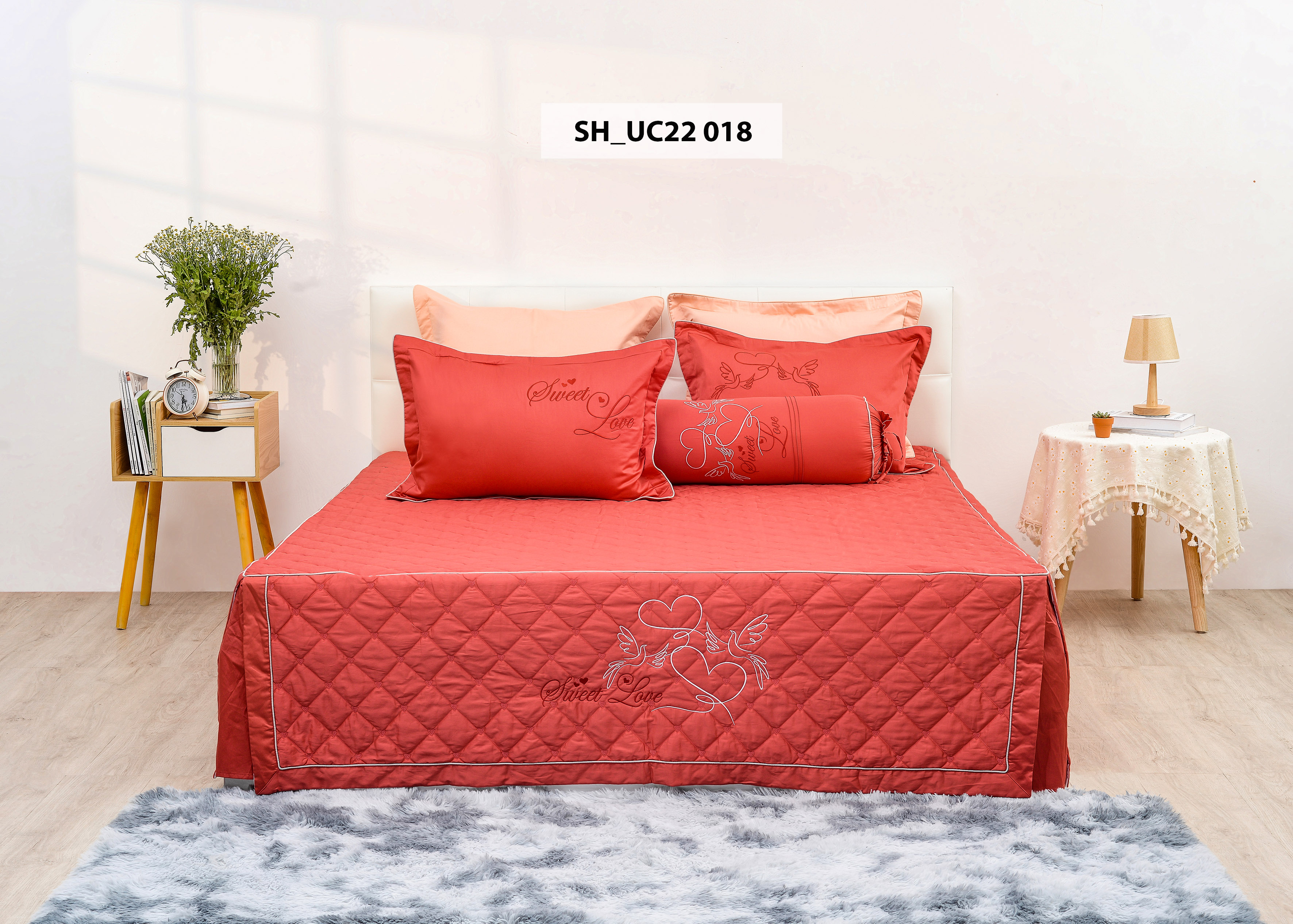 UC22 018: Màu đỏ là chủ đạo của bộ chăn ga gối UC22 018, với họa tiết cực kỳ đơn giản nhưng rất hiện đại trẻ trung. Không quá cầu kỳ về hình thức nhưng mẫu toát lên vẻ sang trọng hiện đại. Sản phẩm được sản xuất trên dây chuyền hiện đại, được những người thiết kế hàng đầu sáng tạo ra.