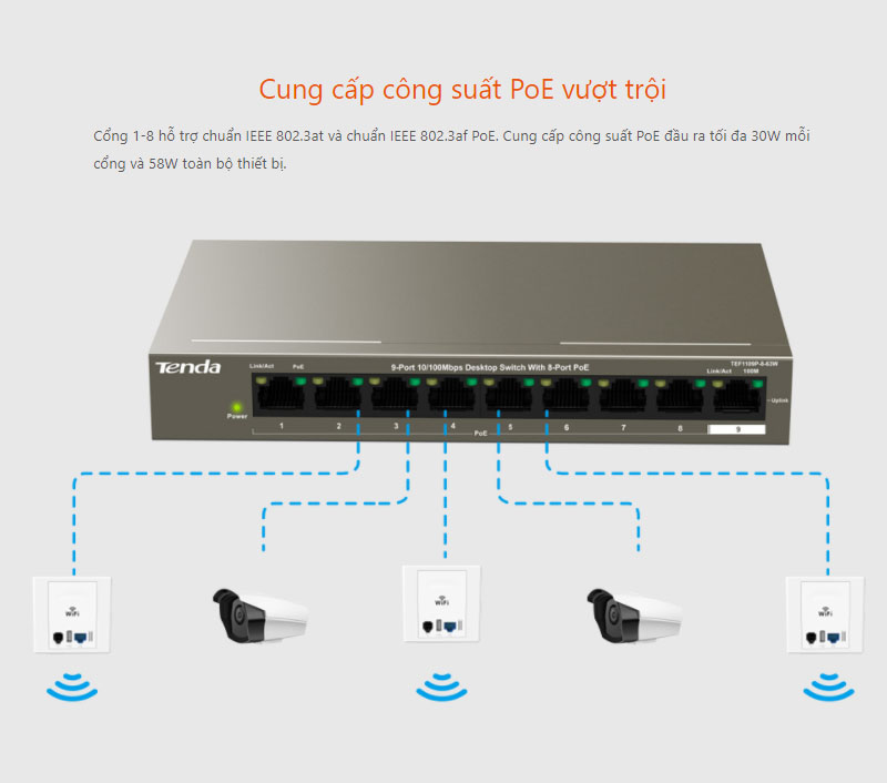 Bộ chia mạng switch 9 cổng 10/100Mbps TEF1109P-8-63W Tenda chính hãng Được thành lập vào năm 1999, Tenda Technology là nhà cung cấp nổi tiếng hàng đầu cho các thiết bị mạng, cam kết