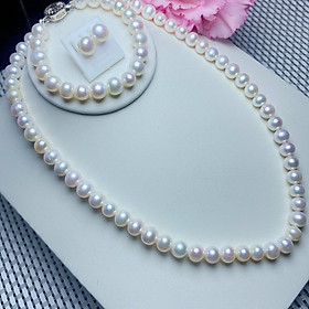 Chất liệu: Ngọc trai nuôi Kích thước: Hạt 8 - 9 mm Bao gồm: Dây chuyền đeo cổ, vòng đeo tay và bông tai Sang trọng để làm quà tặng người phụ nữ yêu quý