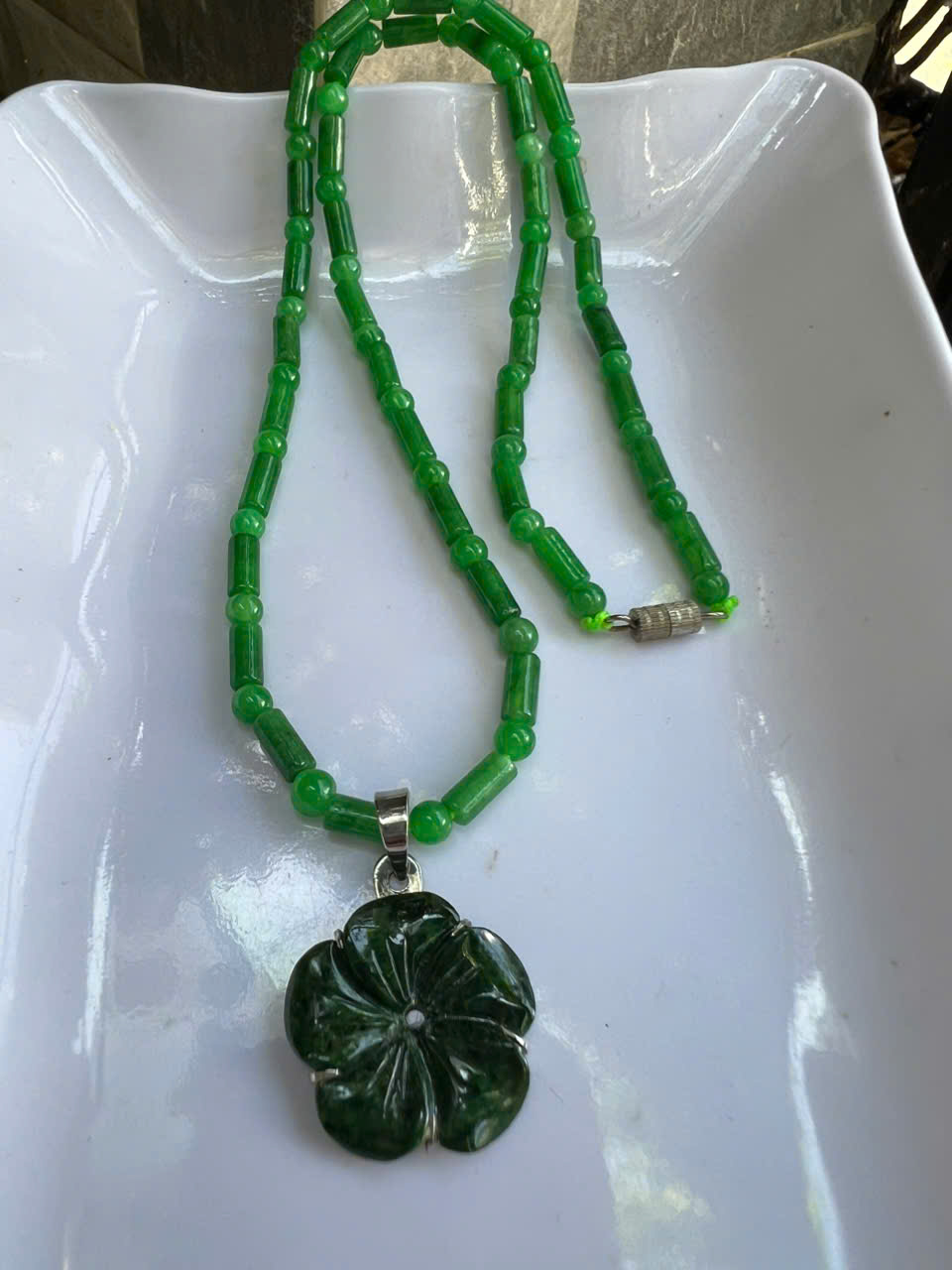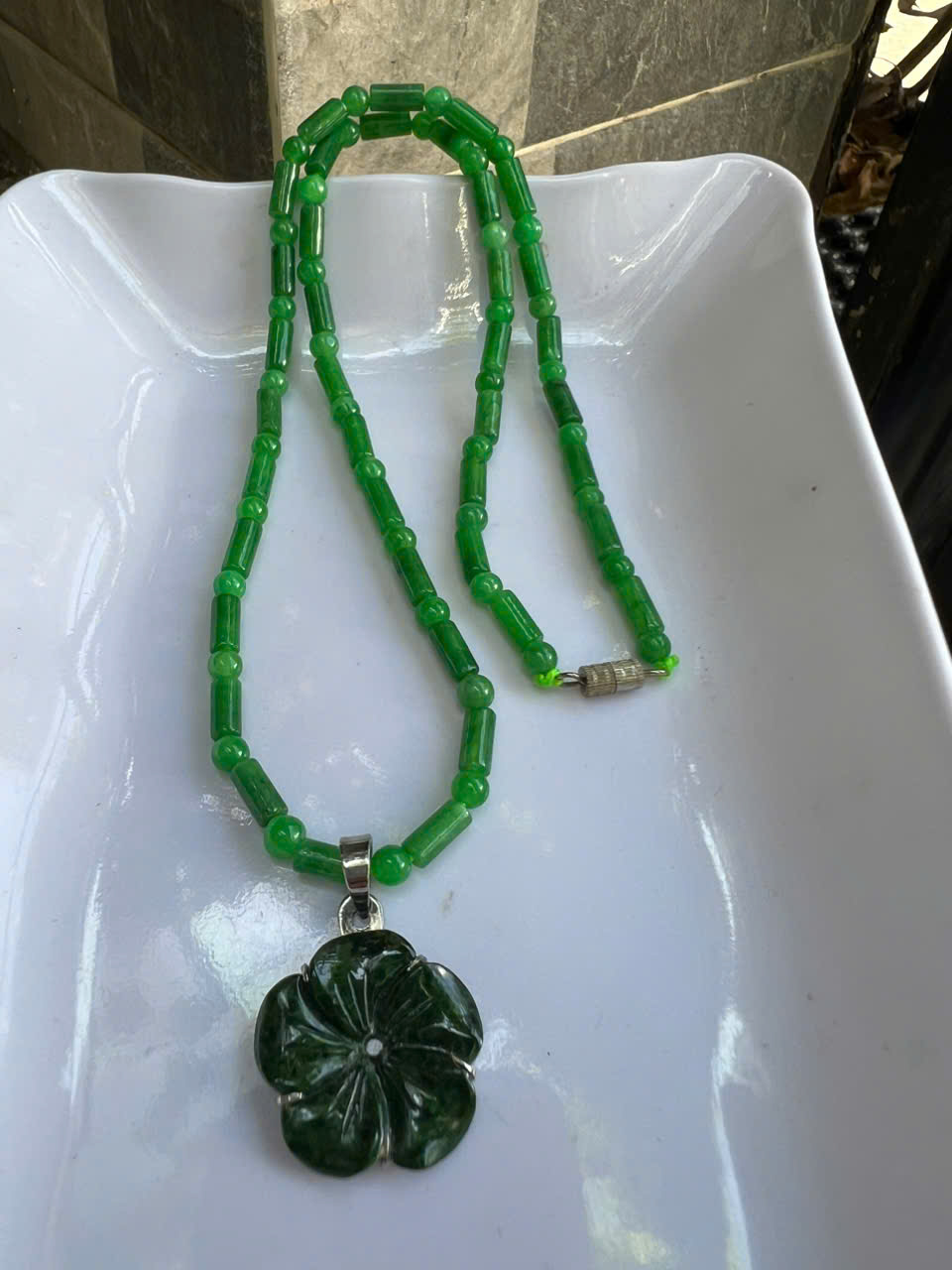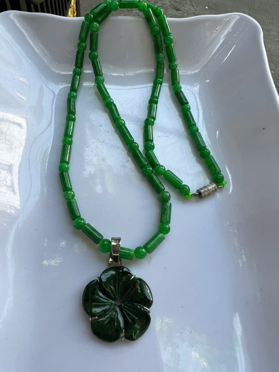 Thiết kế độc đáo: Bộ dây chuyền sợi trúc kiểu xanh phối mặt bông hoa mai. Đá cẩm thạch tự nhiên xanh ngọc đậm đẹp.