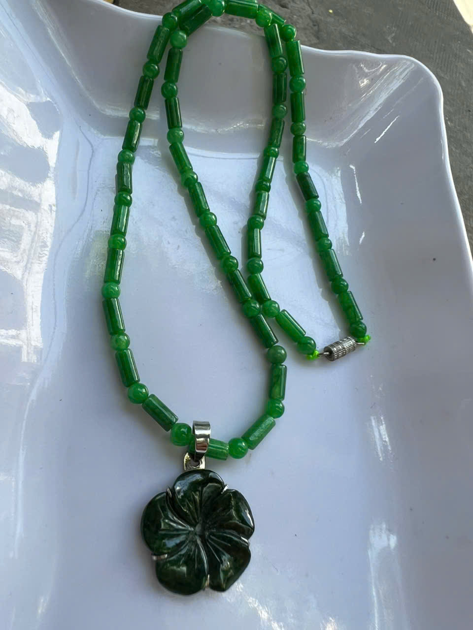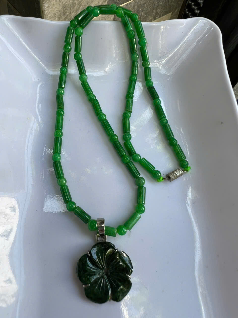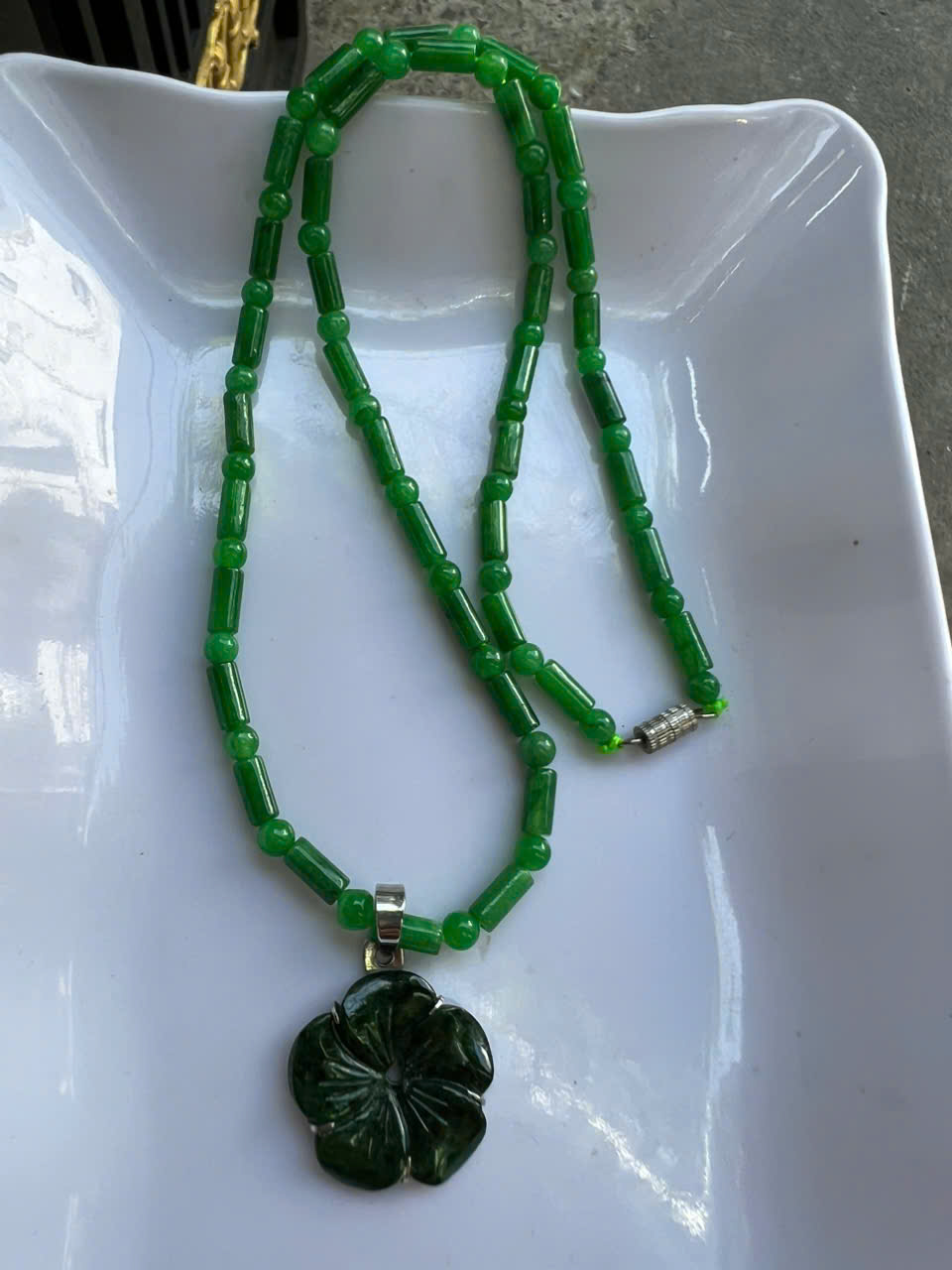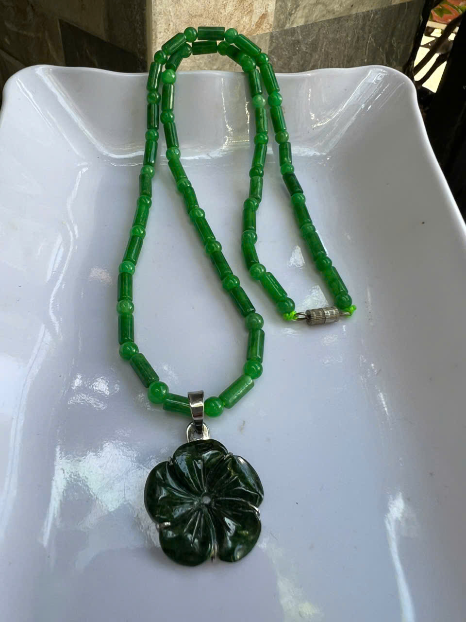 Thiết kế độc đáo: Bộ dây chuyền sợi trúc kiểu xanh phối mặt bông hoa mai. Đá cẩm thạch tự nhiên xanh ngọc đậm đẹp.
