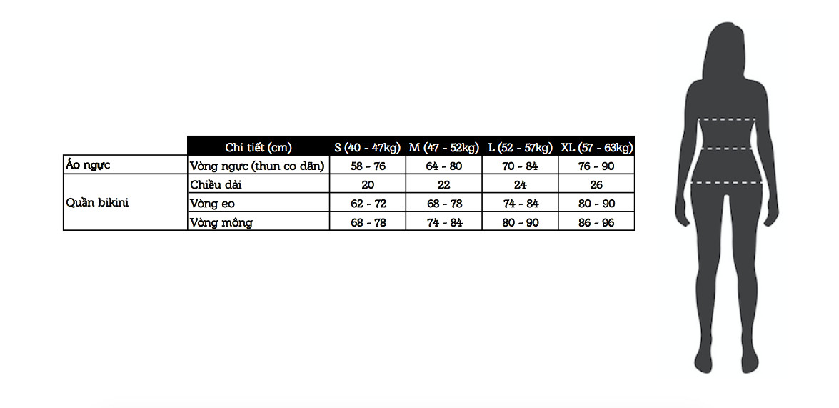 - Size Nữ (tùy chiều cao): One Size cho cân nặng từ 38-50Kg - Màu chủ đạo: Nhiều màu và mẫu theo lựa chọn của khách hàng. - Thiết kế hai mảnh, có sẵn mút