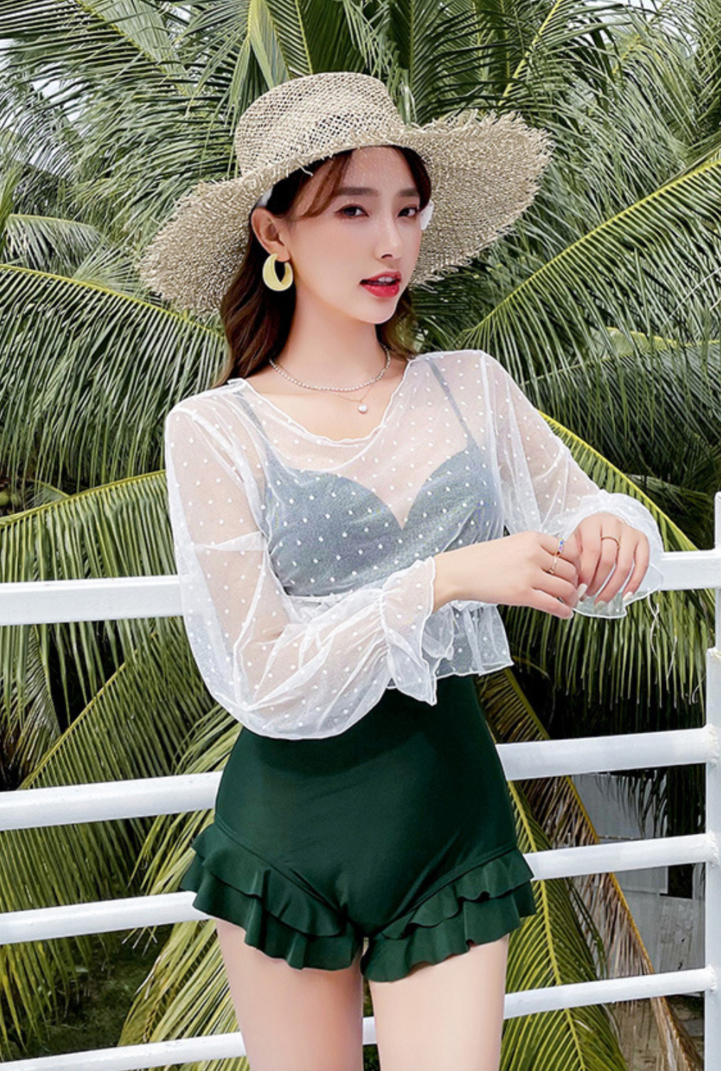 ✨Bộ đồ bơi bikini nữ 1 mảnh đi tắm biển kèm áo croptop ren trắng chấm bi tiểu thư hot trend 2021- B05